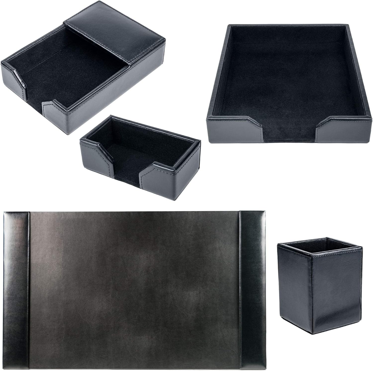 - CONTENTS: This leather desk organizer set includes a 30" x 18" side-rail desk pad, a front-load letter-size tray, a pencil cup, a 4" x 6" memo holder and a business card holder.