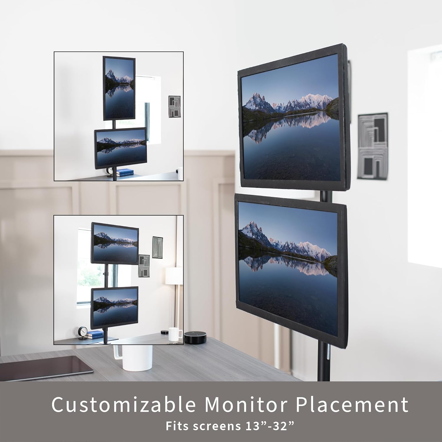 - Articulation and Height Adjustment: Adjustable mount offering +15° to -15° tilt, 360° swivel, 360° rotation, and height adjustment along the center pole for optimal viewing angles. Monitors can be placed in portrait or landscape orientation