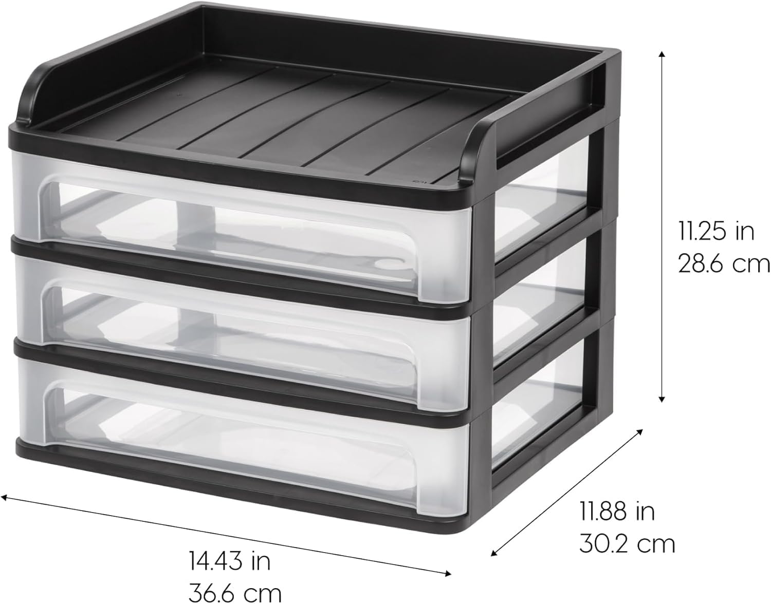 IRIS USA Plastic Desk Top 3-Drawer Storage Organizer with Paper Tray Top, 1-Pack, for Makeup Vanity Nail Polish Bathroom Stationery Art Craft Supplies Kitchen Office Garage Organization, Medium, Black