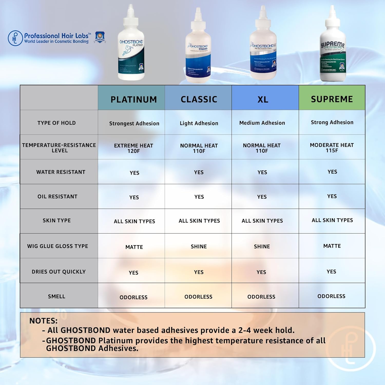 - LESS PRODUCT APPLICATION REQUIRED: The GHOSTBOND Platinum hair glue is specially designed for those with oily skin and scalps, heavy perspiration and those in climates with high moisture and humidity. It requires less product compared to other GHOSTBOND adhesives, making it a cost-effective option for those who use the product frequently.