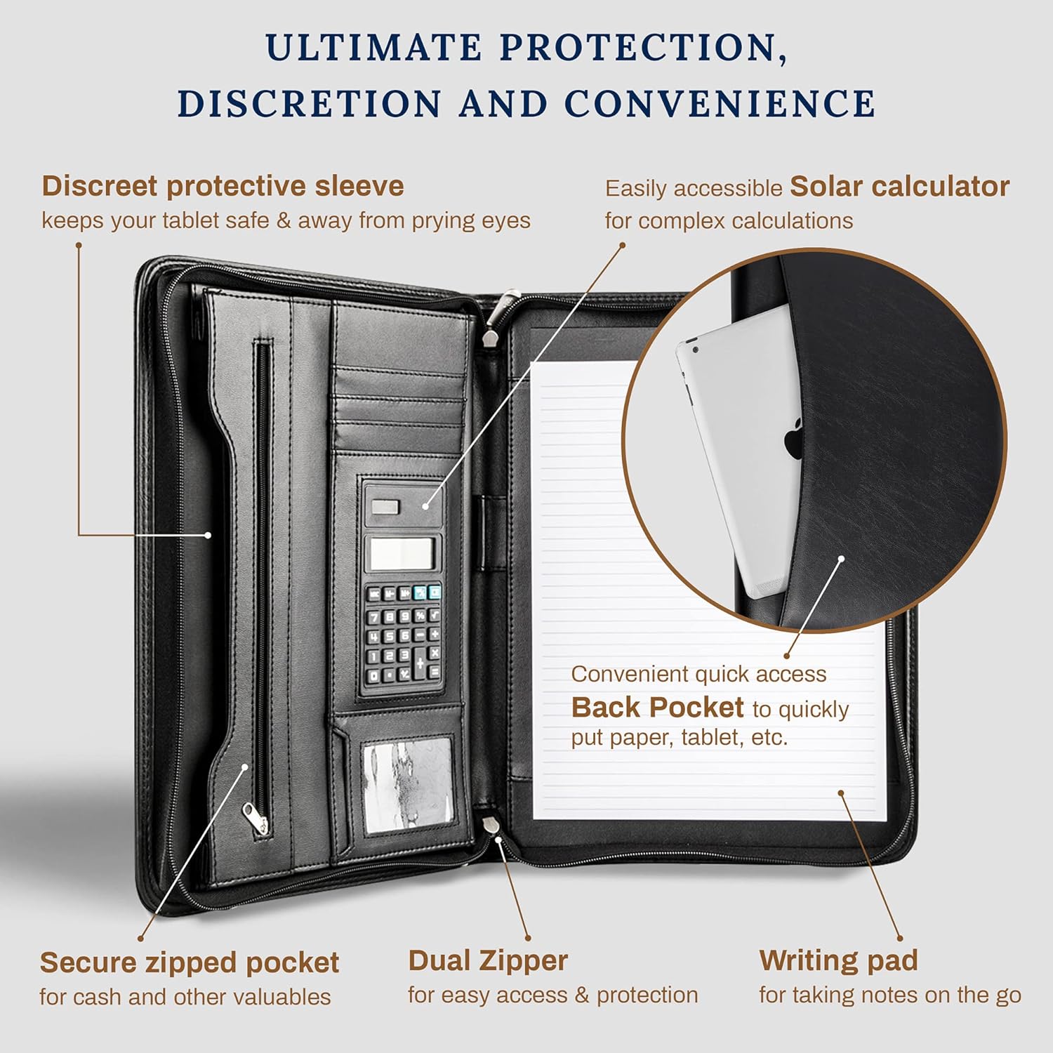 - Still superior, and now upgraded for life’s biggest advancements: Originally crafted to suit the advanced professional, we recently added smart changes to this customized vegan leather portfolio for those returning to pursue their MBA, or interviewing for that next wrung up the ladder; features include solar calculator, full PU leather interior, dual start zipper, and abundant storage so paper never crunches or falls out
