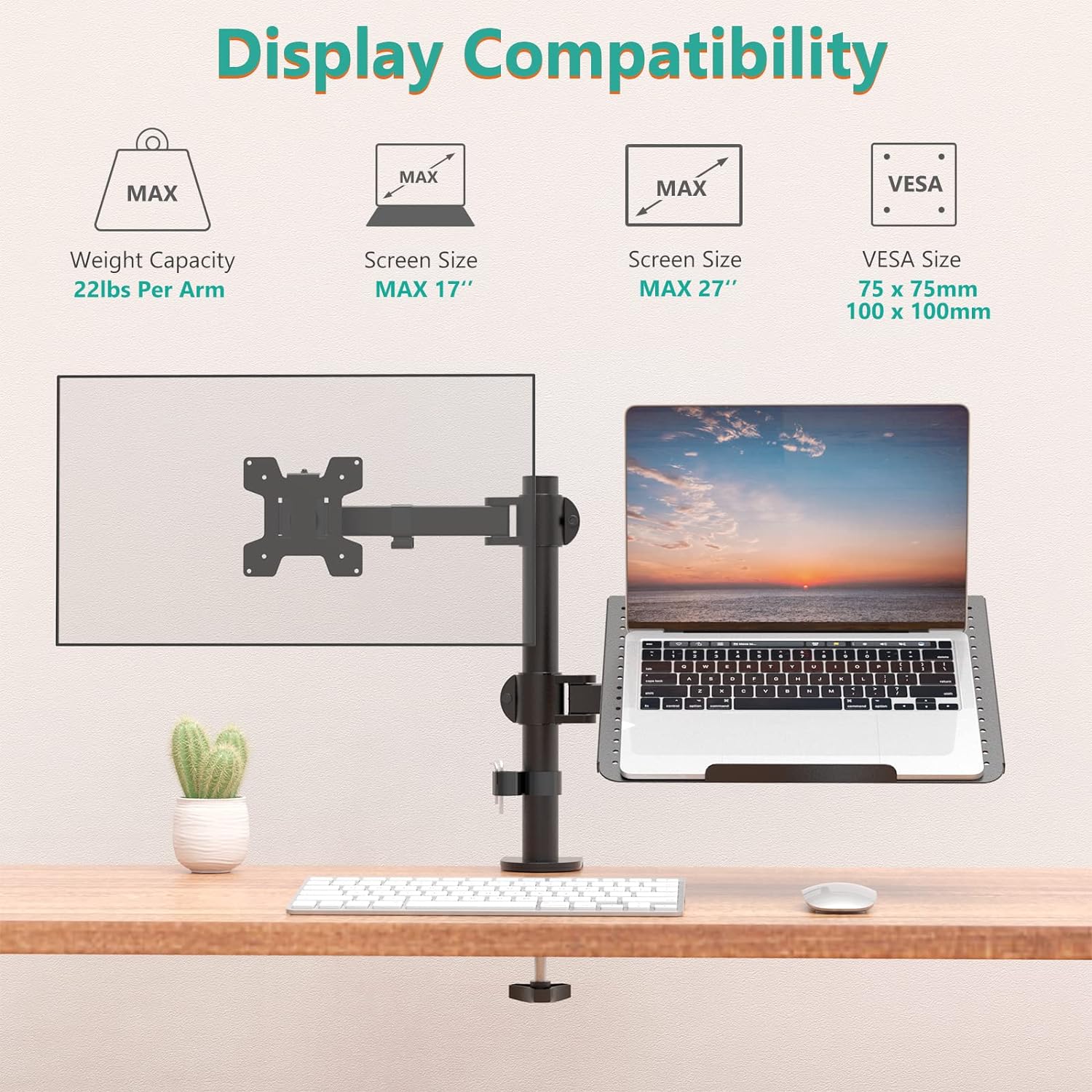 WALI Laptop and Monitor Stand, Fully Adjustable Monitor Mount and Laptop Tray for 1 Notebook up to 17 inch and 1 Screen up to 27 inch, 22 lbs, Weight Capacity (M001LP), Black