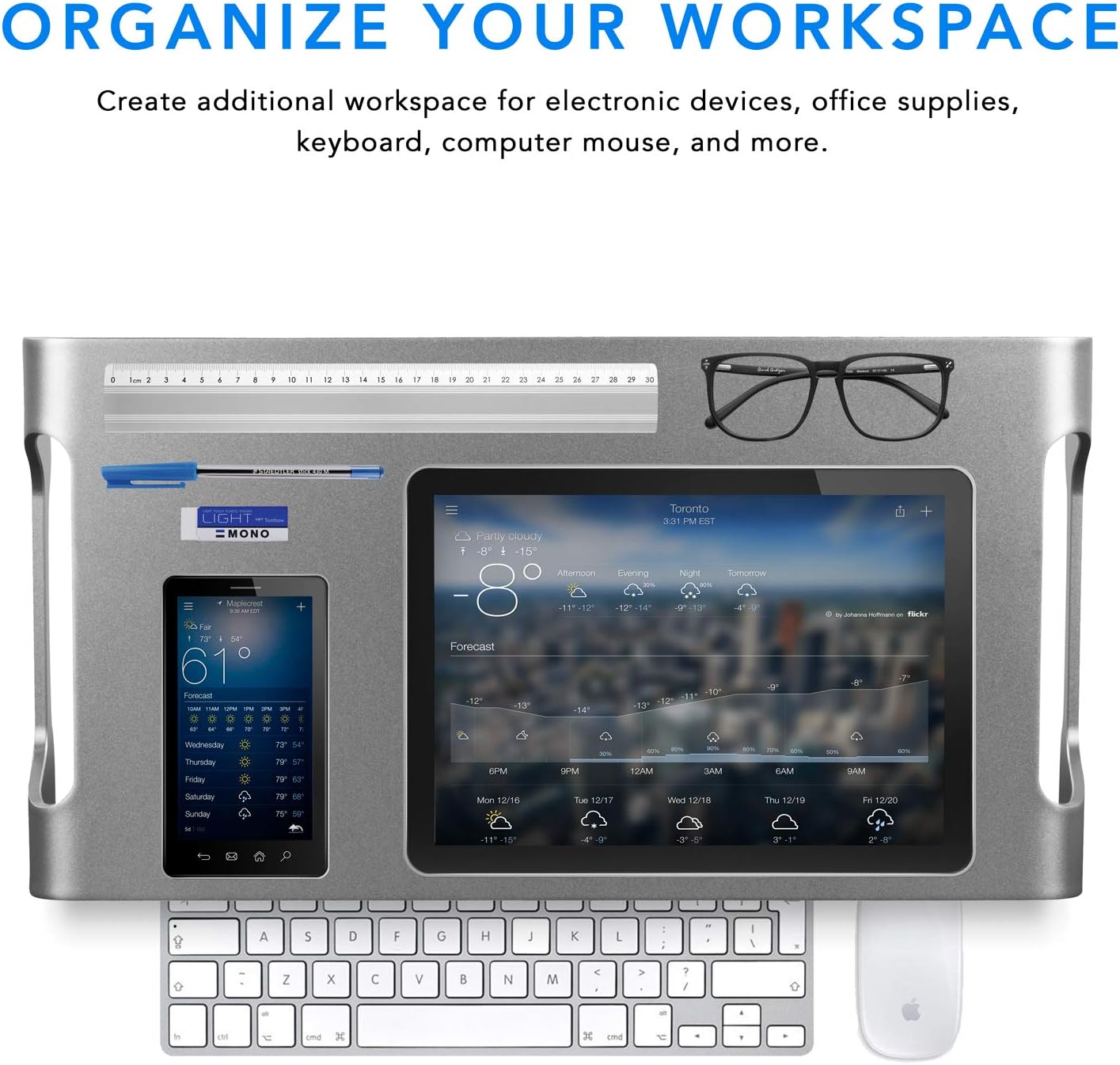 - Desk Organizer - Maximize your desktop with this space-saving monitor riser with cable management; Stow your keyboard, mouse and other peripherals under the wide monitor stand