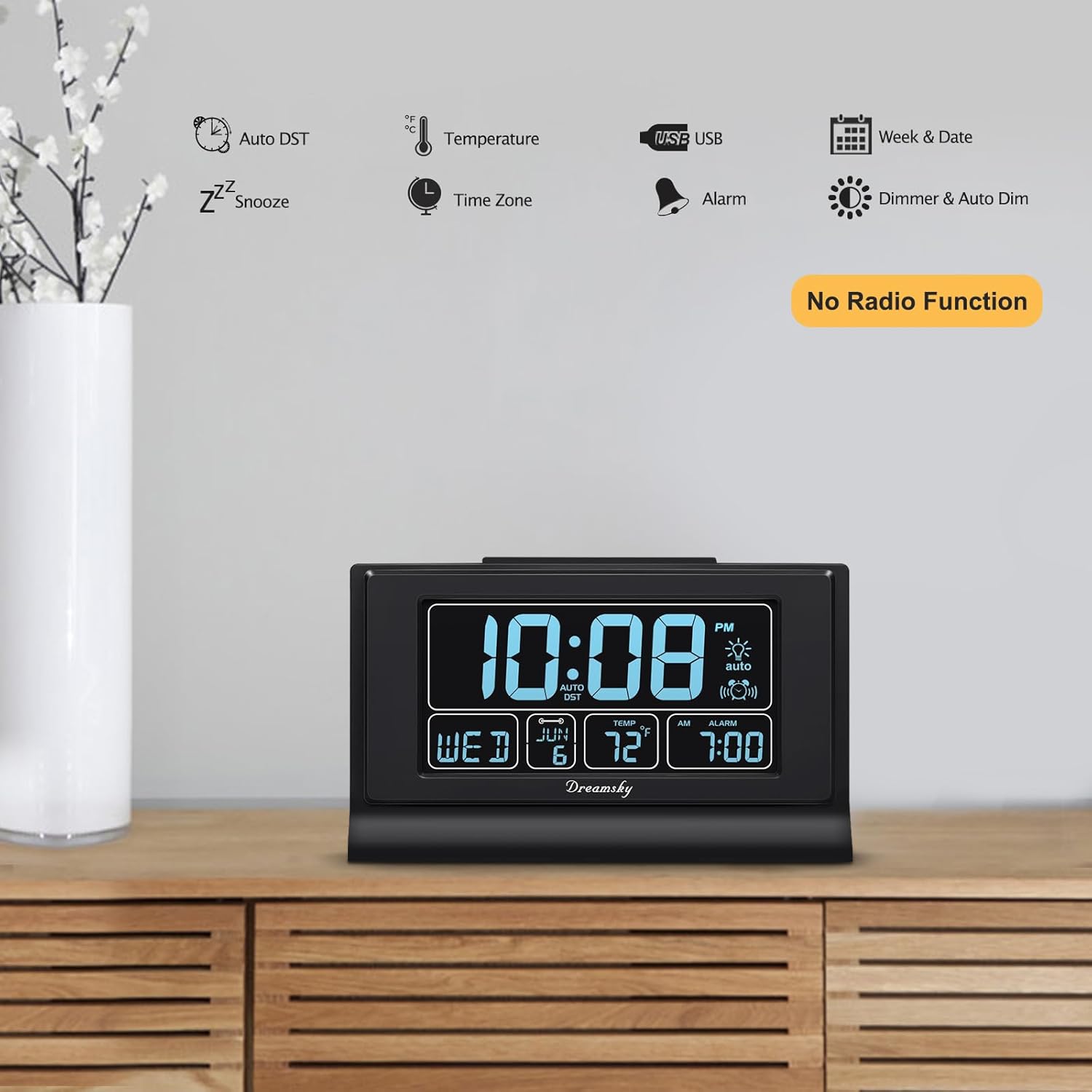 - Special Feature : auto dimmable, self setting, date, day of week, thermometer, auto dst, battery backup, electric clock for desk, nightstand, bedside, living room, bedroom, office, small gifts auto dimmable, self setting, date, day of week, thermometer, auto dst, battery backup, electric clock for desk, nightstand, bedside, living room, bedroom, office, s⦠See more