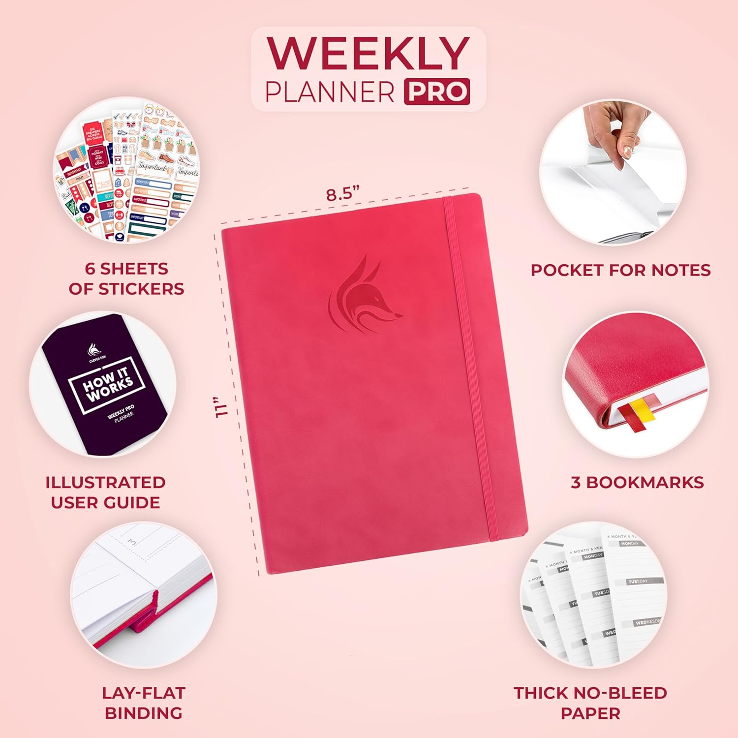 Clever Fox Planner PRO – Weekly & Monthly Life Planner to Increase Productivity, Time Management and Hit Your Goals, 8.5x11″ (Dark Pink)