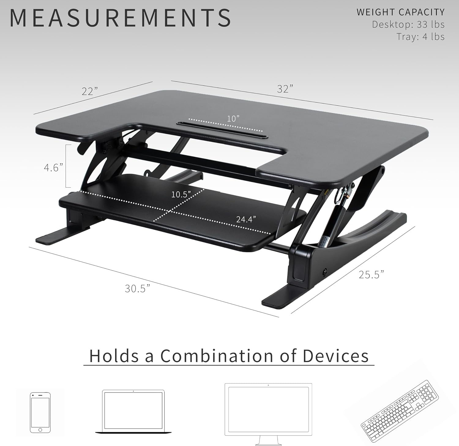 - Space Efficient 32" Surface: The top surface measures 32" x 22", which maximizes space while still providing room for dual monitors. The 24.4" x 10.5" keyboard tray raises in sync with the top surface to create a comfortable workstation