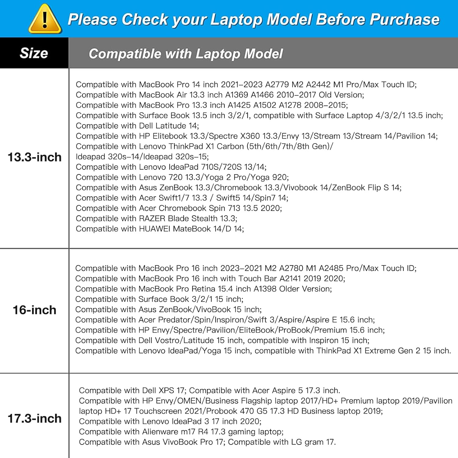 - Compatible with MacBook Air 15 inch M4 A3241 M3 A3114 M2 A2941 2025 2024 2023, compatible with MacBook Pro 16 2025-2019 M4 A3403 A3186 M3 A2991 M2 A2780 M1 A2485 A2141, compatible with MacBook Pro 15 A1990 A1707 A1398; Compatible with Surface Laptop 5/4/3 15, compatible with Surface Book 3/2/1 15; Compatible with Asus ZenBook/VivoBook 15; Compatible with Acer Swift 3/Swift 5/Aspire 3/5/7 15.6; Compatible with HP ProBook/Spectre x360/Envy x360 15.6; compatible with HP Omen/Pavilion x360 15.6.