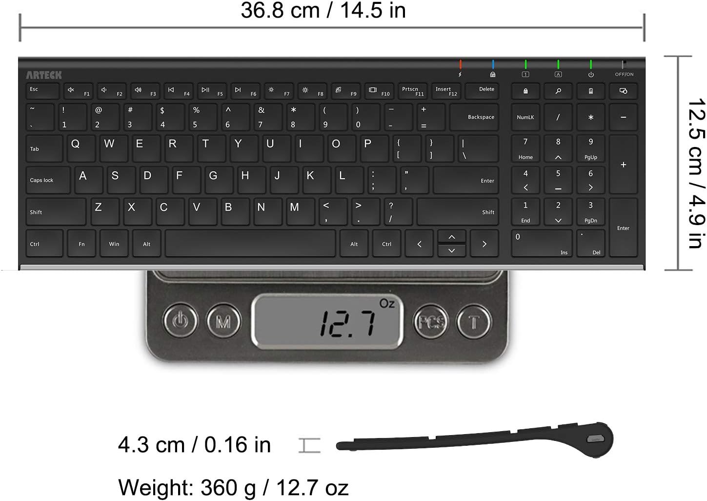 - Ultra Thin and Light: Compact size (14.5 X 4.9 X 0.6in) and light weight (12.7oz) but provides full size keys, number pad, shortcuts for comfortable typing.