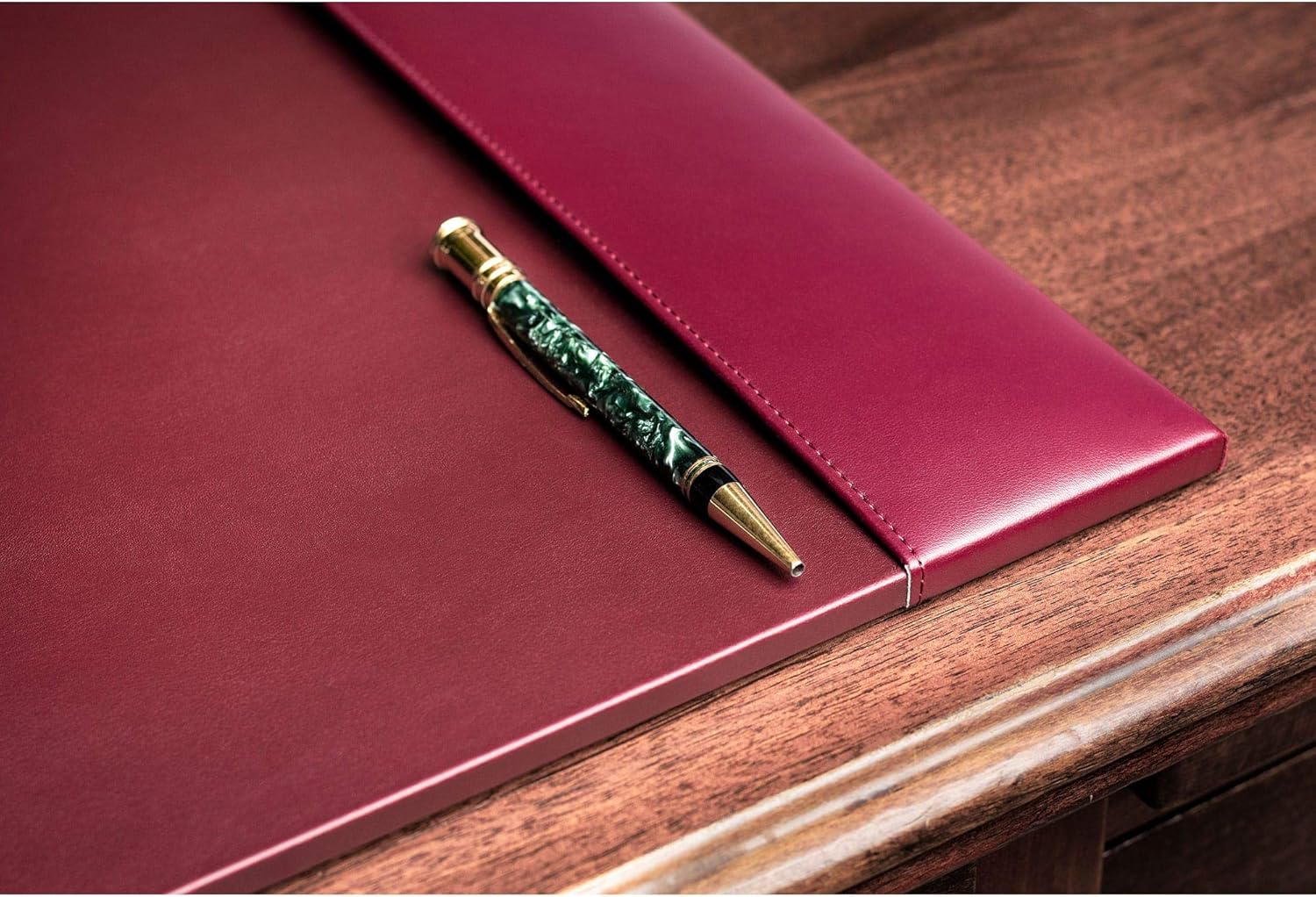- DIMENSIONS: This Burgundy leather desk mat measures 30” x 18” x .5”, with each side rail measuring approximately 3” wide.