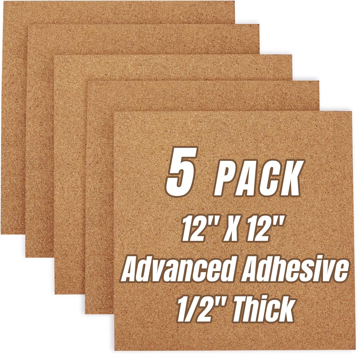 Cork Board Tiles 12"x12" - 1/2" Thick 5 Pack Cork Board Square Bulletin Boards Self Adhesive Corkboards for Walls Pin Boards Corkboards for Office Home School Decor