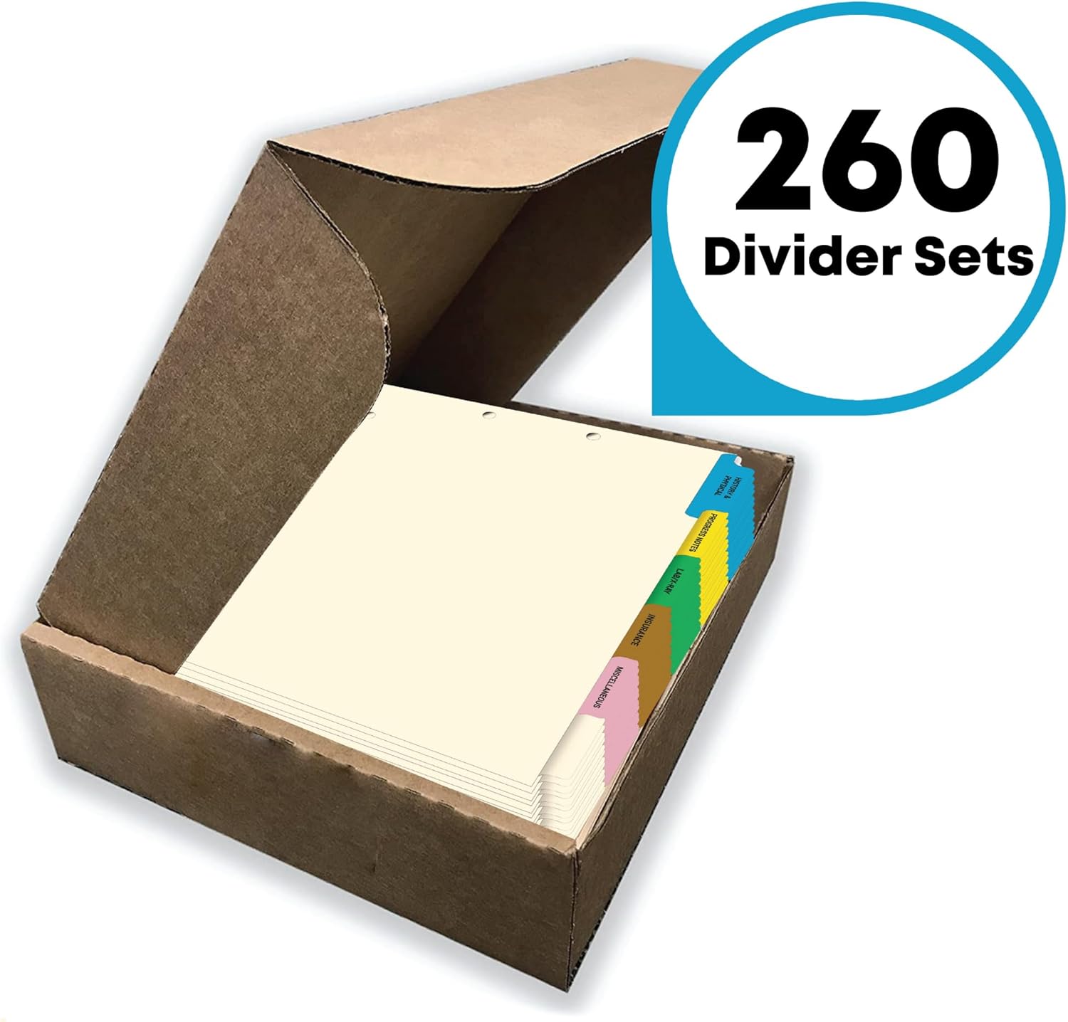 - DIVIDER SET DETAILS: Each set of file dividers is pre collated and has 6 color coded tabs. Each set consists of the following pre printed tab titles: Position 1 - HISTORY & PHYSICAL (Blue Colored Tab), Position 2 - PROGRESS NOTES (Yellow), Position 3 - LAB/X-RAY (Green), Position 4 - INSURANCE (Brown), Position 5 - MISCELLANEOUS (Pink), Position 6 - BLANK WRITE-ON. Contains 260 complete sets of 6 index tabs.