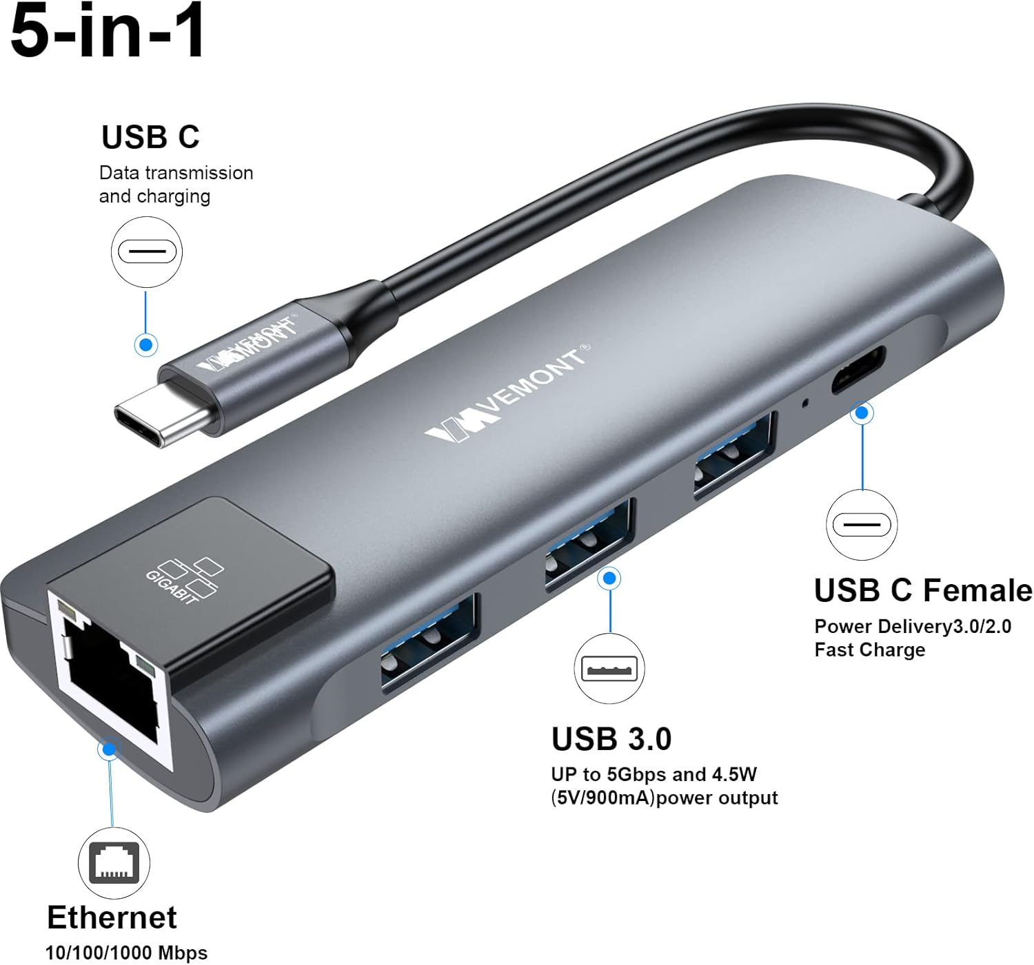 VEMONT USB C hub,5 in1 USB-C hub, Type-c multiport Adapter with Gigabit Ethernet, 3 USB 3.0 hub for Data, 100W Power Delivery, USB c hub for Laptop MacBook/ipad, and Other USB C Devices