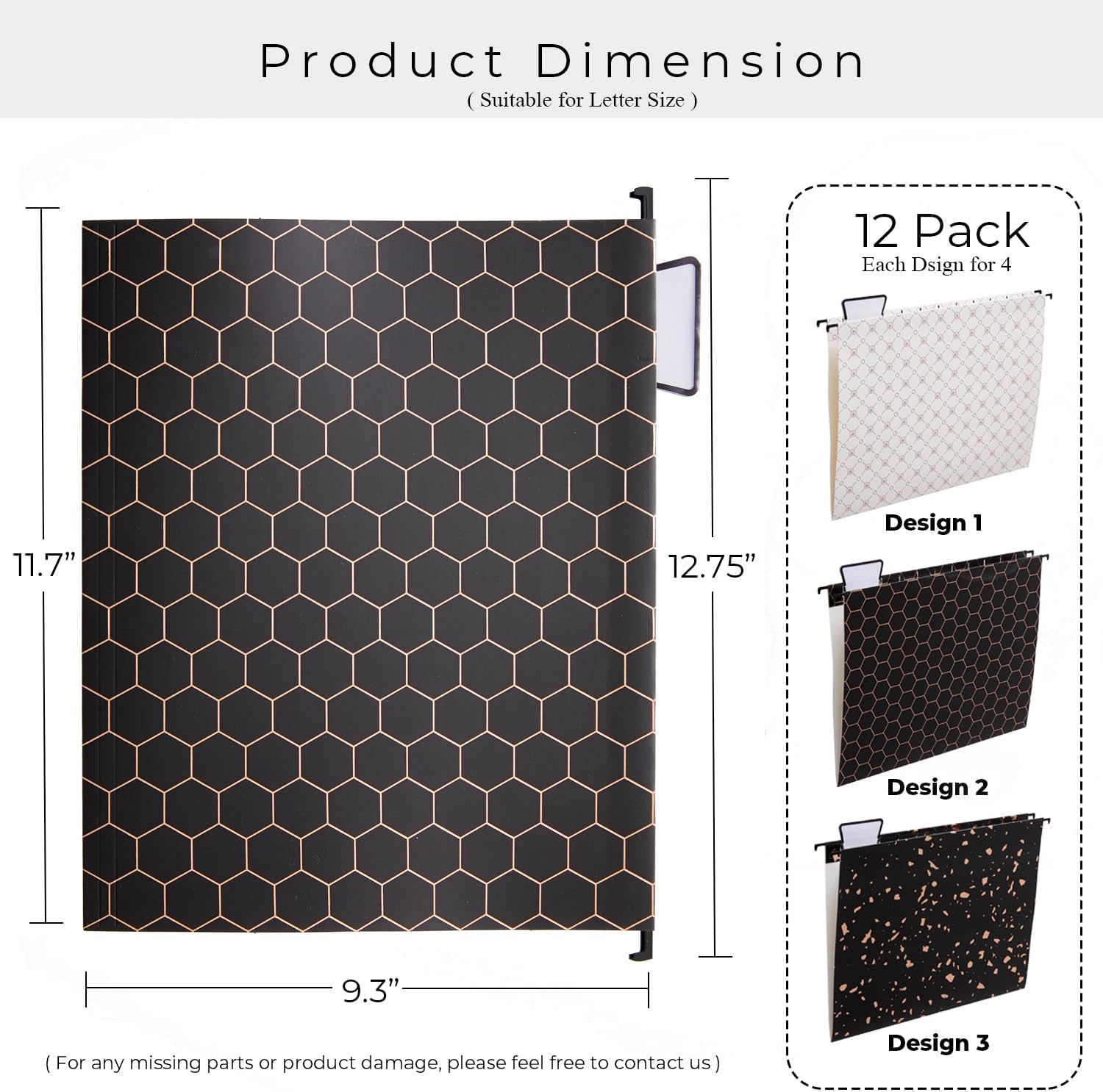 - Folder Dimension - Top metal bar's length is 12.75”, file folder size is 11.7" W x 9.3" H. You will receive 12 folders + 12 customized tabs (3 Black Foil Design x 2). For any accessory lost, please free to contact us