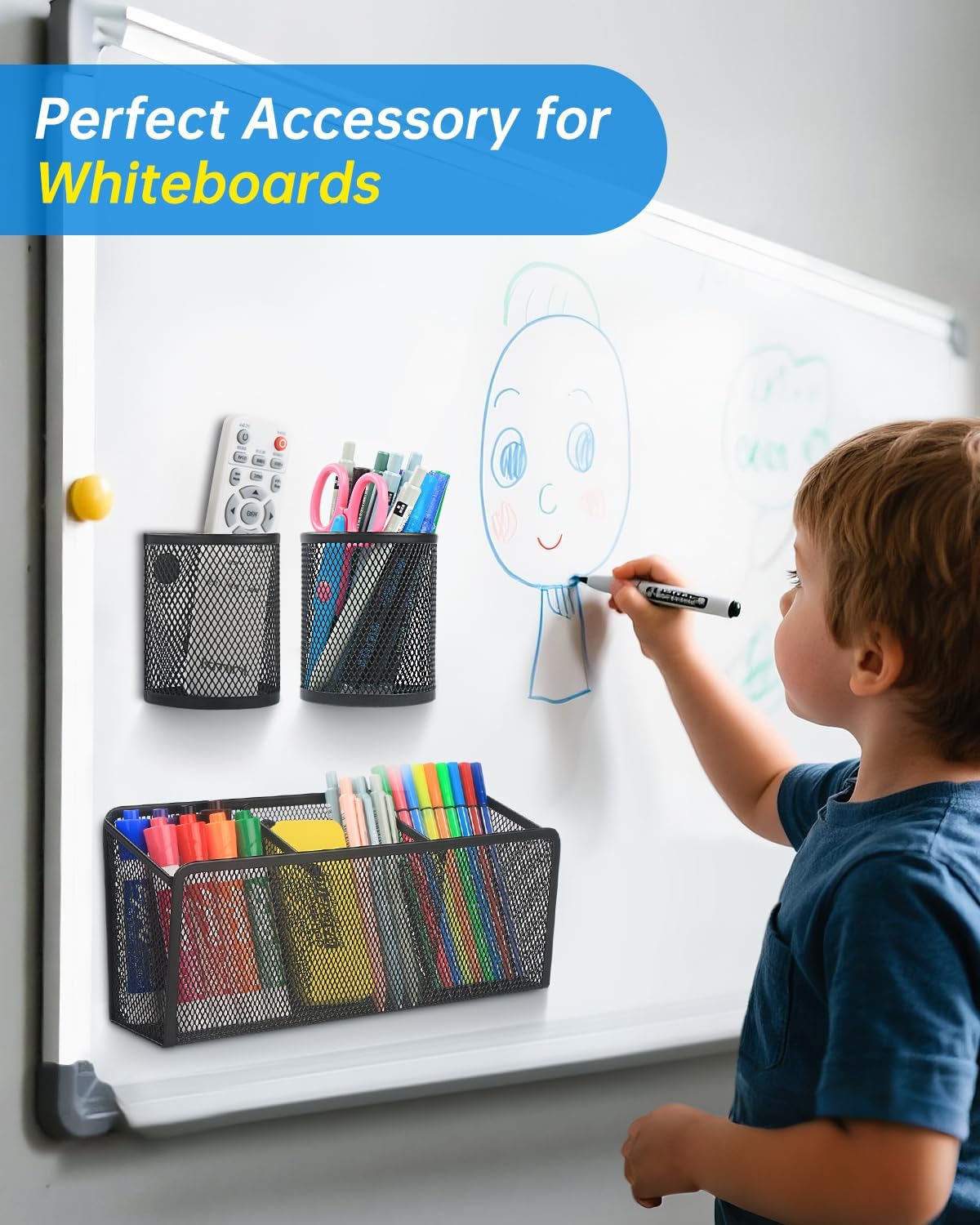 - Our pen holders are made of durable metal mesh and strong magnets. Large capacity for classrooms school office kitchen supplies. It is good idea for whiteboards lockers refrigerators desks and pegboards organization, including pencils, markers, pens, drawing tools, clips, erasers, and more.