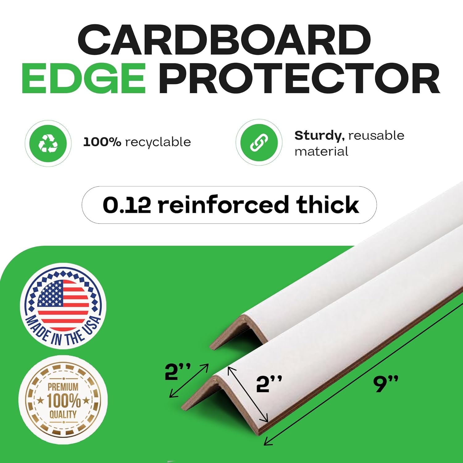 - GENERAL CHARACTERISTICS: V-Board Reinforced Cardboard Edge Protector 2" x 2" x 9" eliminates packaging shifting and minimizes damage during transportation or storage. Made from 100% recyclable cardboard. Cardboard corners for packing, 0.12" thick are white color and available in a wide range of lengths (9", 12", 18", 24", 36", 48"). If you need a different length than available, use the AC-110 Portable Edge Protector Cutter and cut the edge protector to your desired size. This edge protector cutter and cardboard edge protectors in pre-cut lengths are available in our IDL Packaging Store