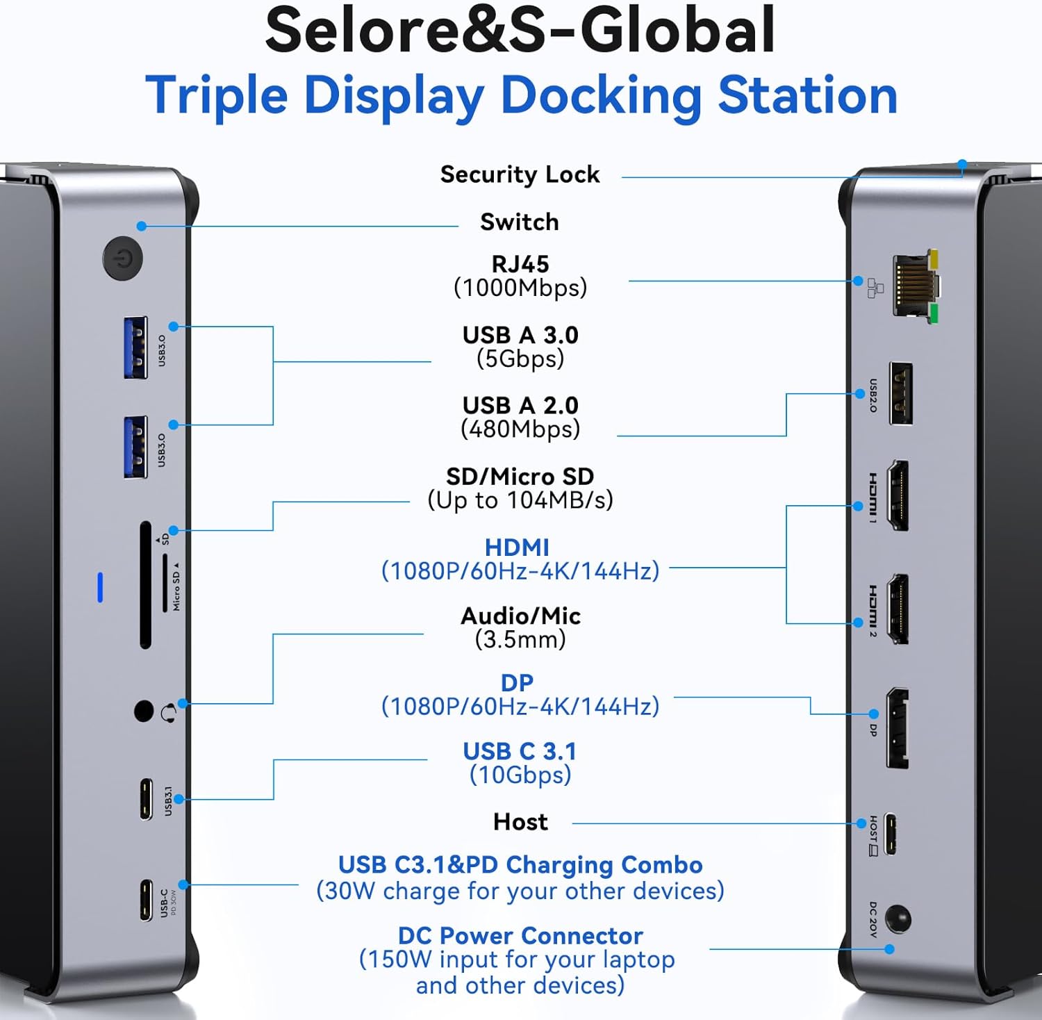 USB C Docking Station 3 Monitors Laptop Dock Dual Monitor with 2 HDMI DisplayPort 4K144Hz,USB A 2.0/3.0,USB C 3.1 10Gbps&30W Output,Ethernet,MicroSD&SD,Audio&Mic,150W DC Power for Dell/Lenovo/HP