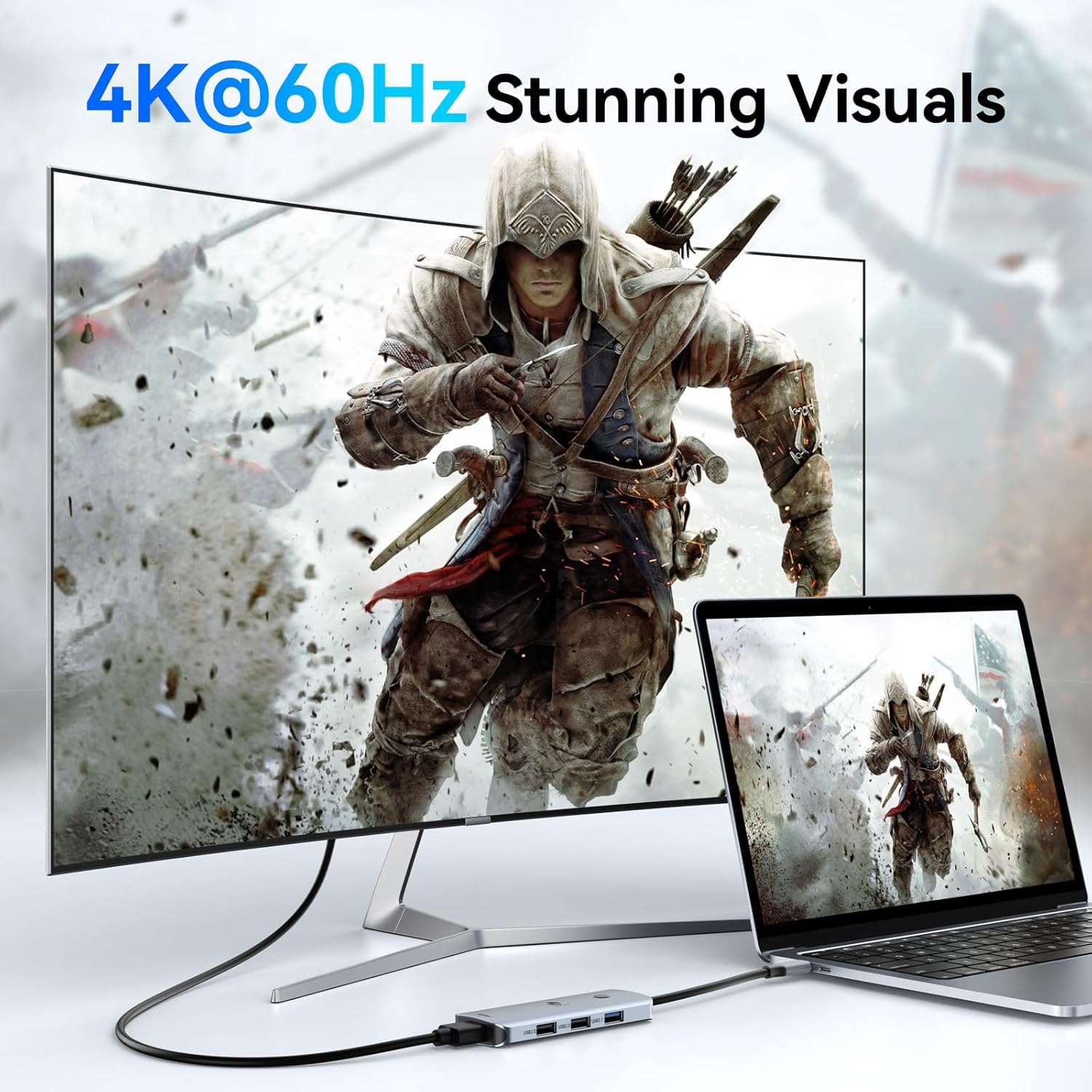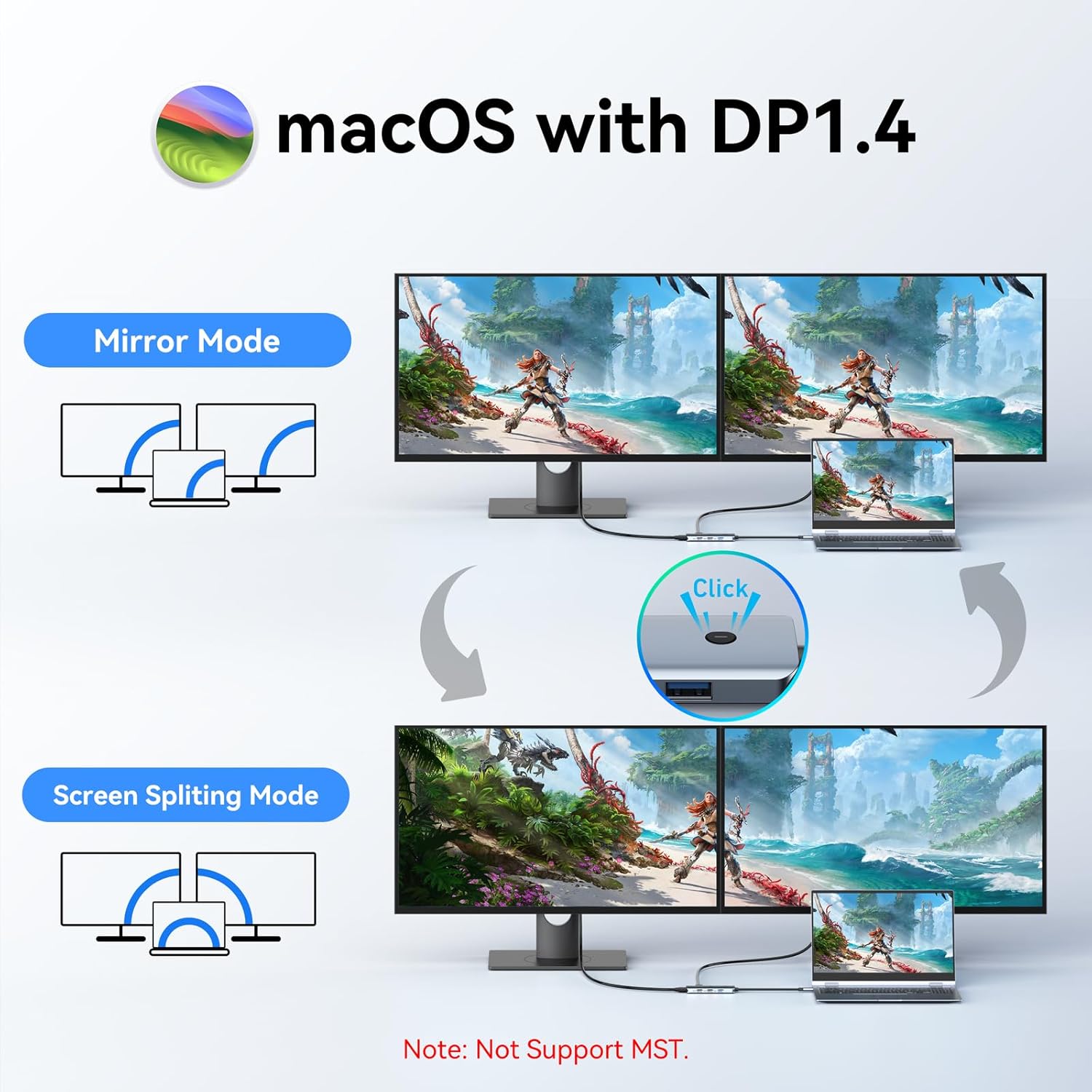 - Split Screen Mode Display: This USB C Hub supports one-click switching between extended mode and split screen mode, and is compatible with both macOS and Windows systems. Immerse yourself in a widescreen visual extravaganza.