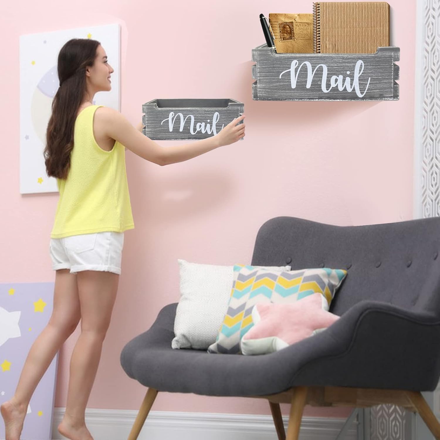 Mail Organizer Mail Holder Countertop, Wood Mail Basket for Wall Table Desk, Envelope Bill Holder for Home Office Decor (Grey)