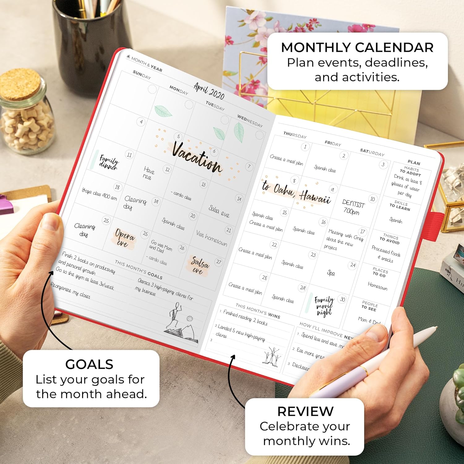 - BEAUTIFUL AND ORIGINAL GIFT – This daily organizer comes in A5 format (14.7 x 21 cm) with a gift box, stickers, user guide, eco-leather hardcover, thick 120gsm paper, pen loop, elastic band, lay-flat binding, and pocket for loose notes.