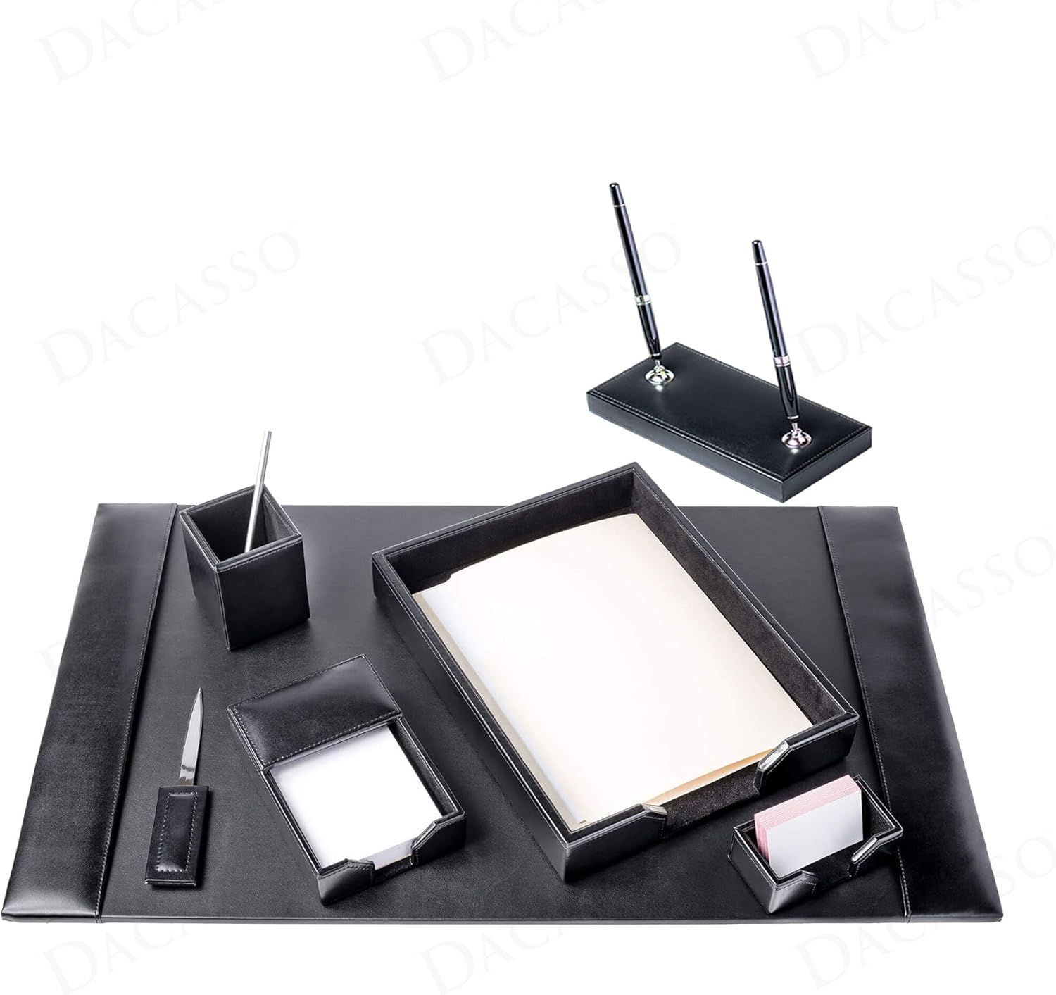 - LUXURY ADDITION TO THE OFFICE SETTINGS: This beautiful bonded leather desk accessory set makes it simple to totally transform the look and function of your desktop. Including a selection of our most popular organizing accessories, this desk set takes the guesswork out of enhancing your office.