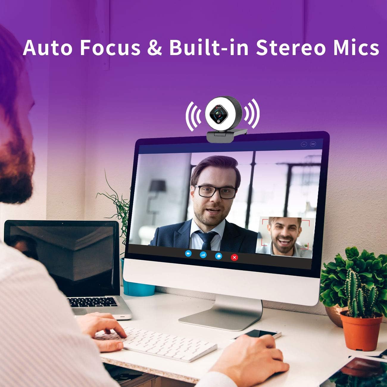 - 3-Level Adjustable Ring Fill Light webcam:The streaming webcam built-in ring light offers lighting compensation at 3 different levels with touch control don't need to go into software settings,so you can achieve ideal brightness conditions by adjusting the ring light in dim light environments. Facial enhancement technology makes you look more confident and professional in livestream.
