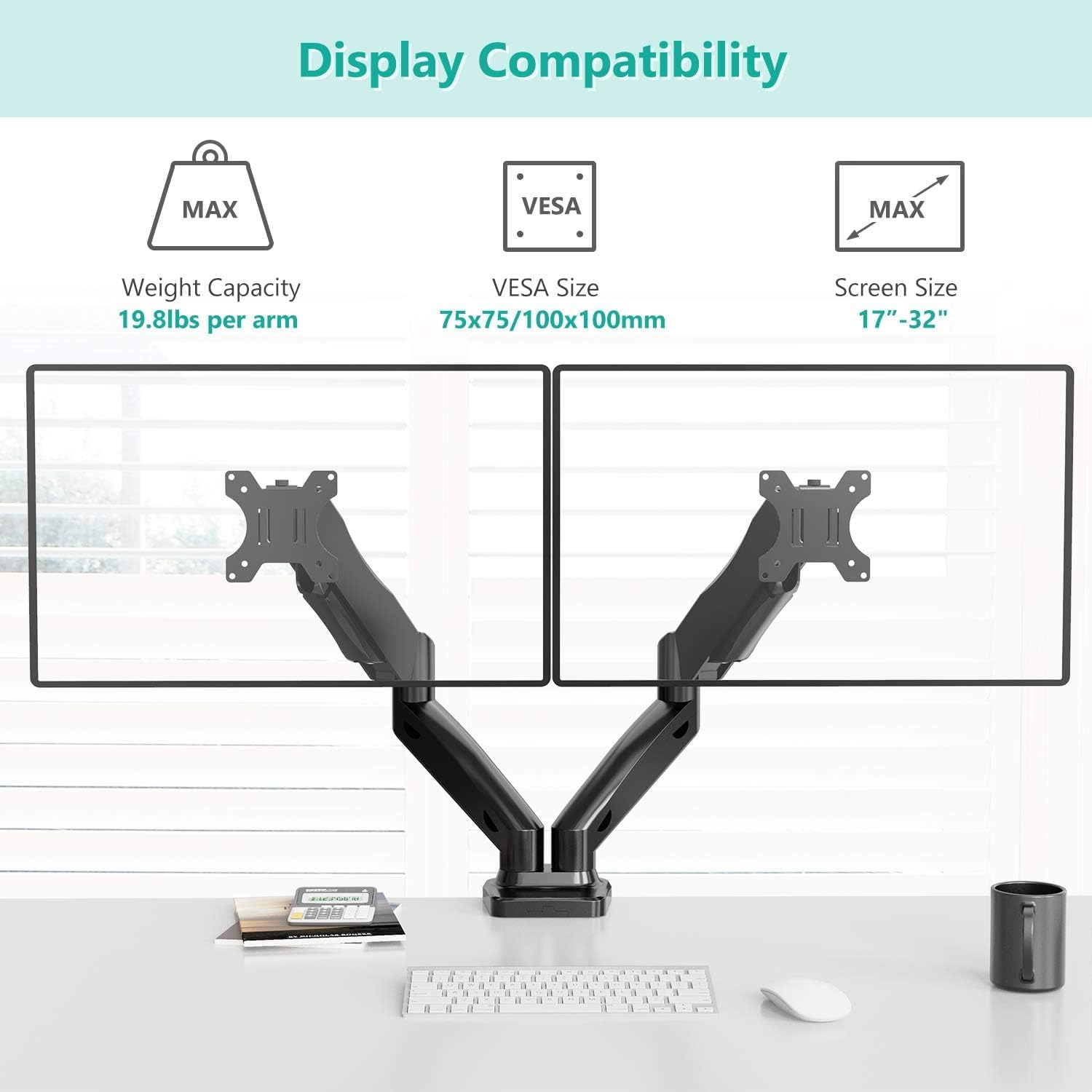- Premium Gas Spring Monitor Arm: Fits monitors from 17” to 32”, and supports up to 19.8lbs. Mounting Holes detachable 75x75mm or 100x100mm. The two-stage locking system is applicable to 0.4”-3.3” thick desk for both C-clamp and Grommet Base. The dual monitor arm with a gas spring system provides smooth and durable adjustments. Please adjust the tension of the gas spring monitor mount properly according to the weight of your monitor.