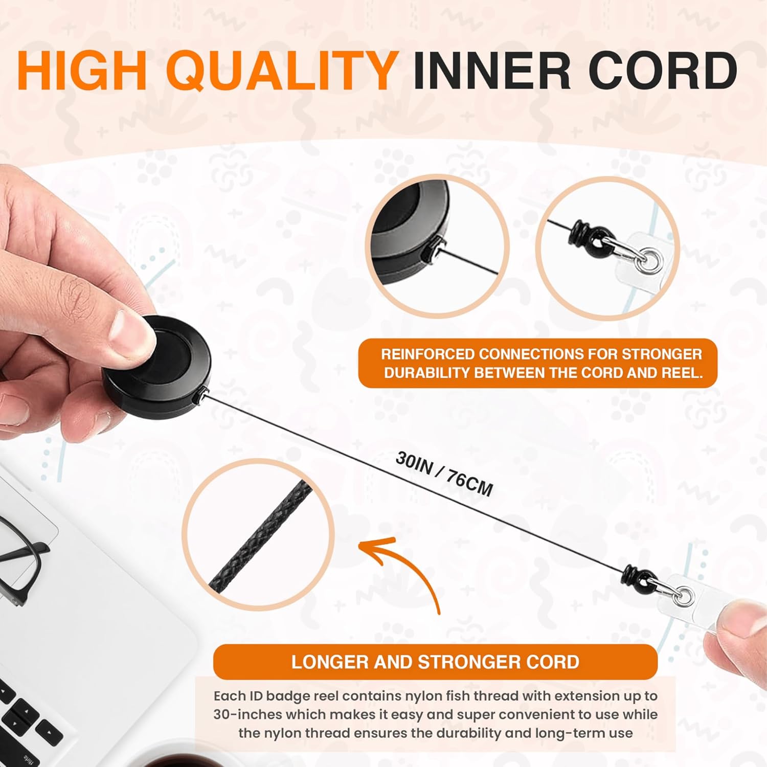 - 【TOP QUALITY BADGE REEL】: Our retractable badge clip is made of high-quality ABS shell and high-strength nylon fish thread of badge clip with 30-inch extension makes retractable badge reel easier to use your ID card. The spring at the joint of id retractable badge holder can reduce the tension and effectively prevents the cord from breaking. All above advantages make it durable