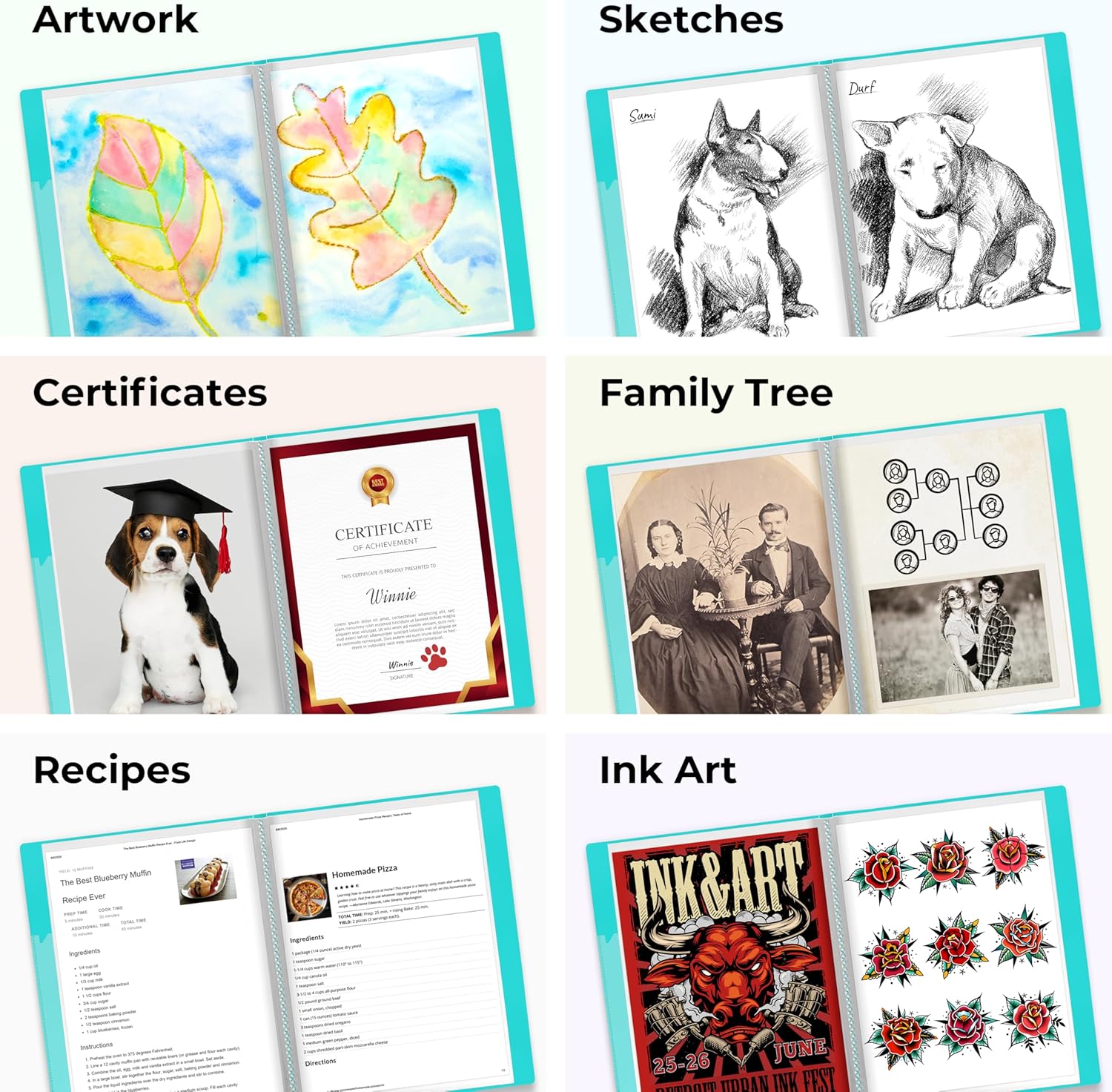 - Includes: 1 Aqua 9x12 poly binder folder with 24 bound (non-refillable) top-loading sheet protector sleeves, Acid-free art portfolio displays 48 viewable pages of 12 x 9 content, A4, or 8.5x11" paper.