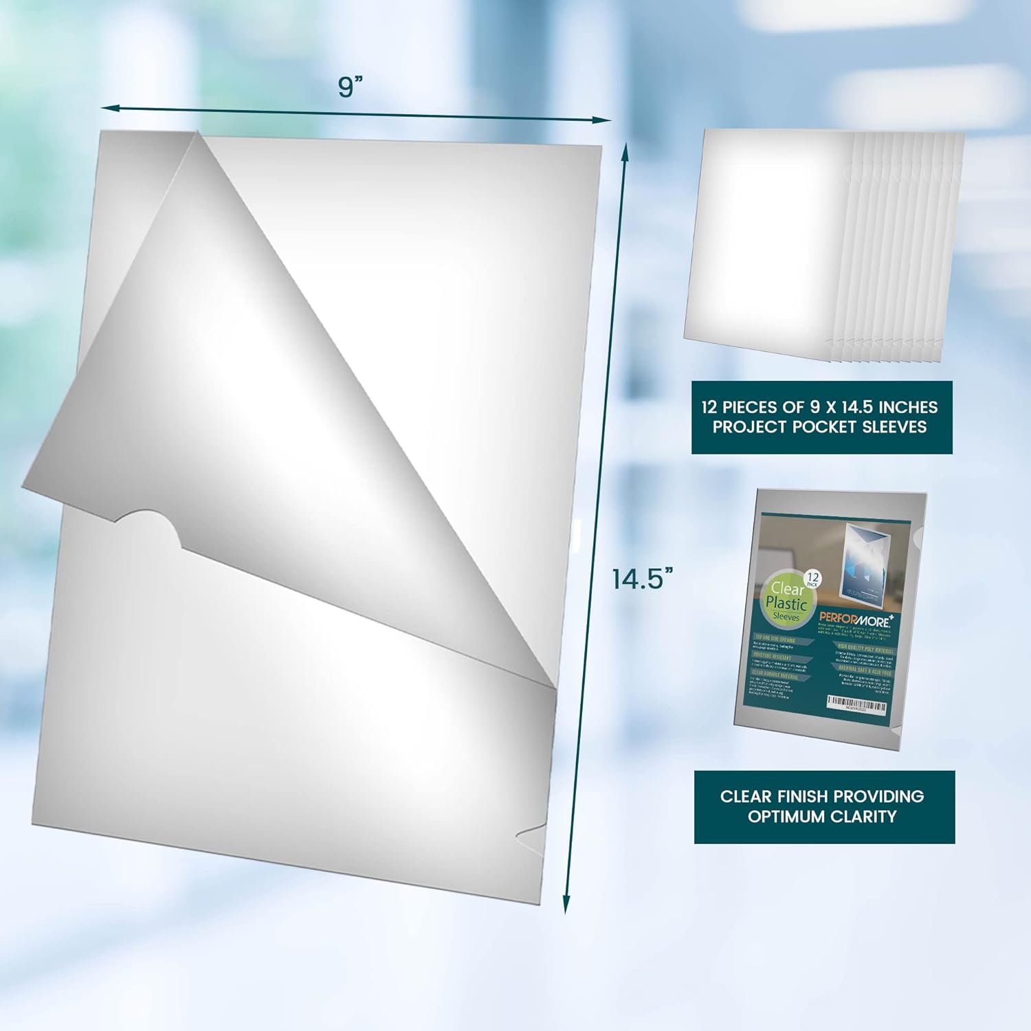 Performore 12 Pack of Clear Project Pocket Sleeves, 9" X 14.5" Legal Size Transparent Plastic Folder Protectors for Documents, Files and Papers, Premium Quality