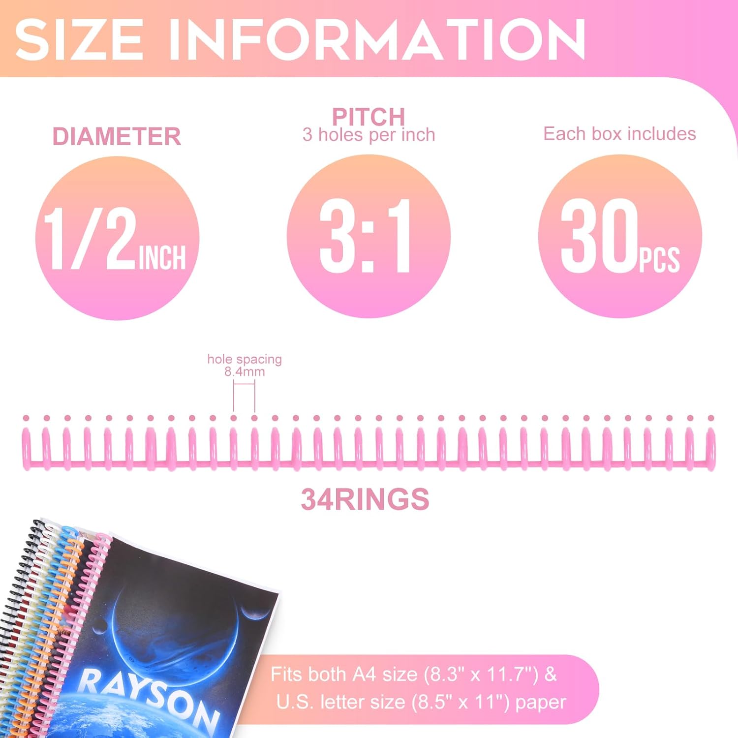 Rayson Click Binding Spines, 34-Hole Click Binding Ring for A4 and U.S. Letter Size Paper, Multi-Color, 1/2" Diameter, 3:1 Pitch, Binds Up to 90 Sheets, 30 Pack