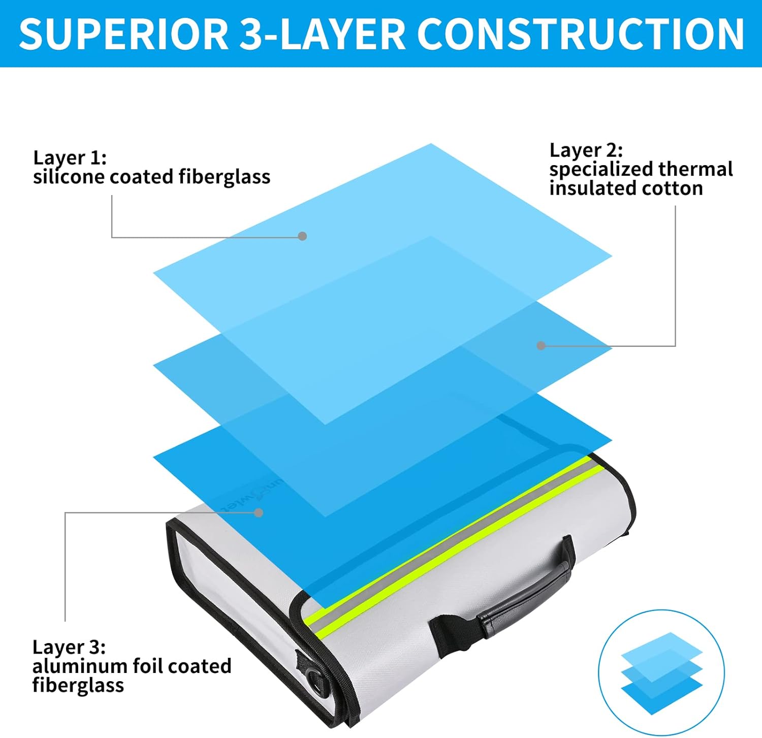 - THERMAL INSULATED + HIGHEST FIREPROOF RATING + WATER-RESISTANT: The fireproof waterproof document boxes can withstand heat up to 2000°F thanks to the hight quality silicone coated Non-Itchy fiberglass fabric. To further protect paper items, there is also a dedicated thermal insulation mid-layer as well as an aluminum foil coated interior. Additionally, the exterior is made of waterproof silicone which enables our fireproof document bags to survive the spray of water in most conditions.