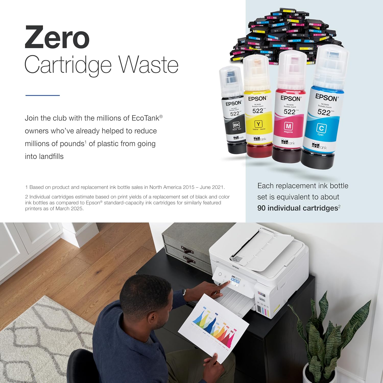 • Innovative Cartridge-Free Printing ― High-capacity ink tanks mean no more tiny, expensive ink cartridges; Epson’s exclusive EcoFit ink bottles make filling easy and worry-free
