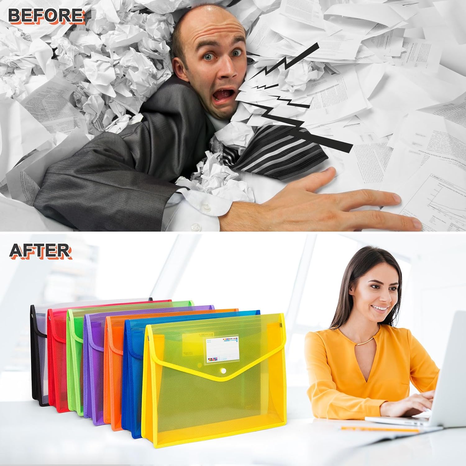- Unique Design: Cloth over-lock and metal reinforced buckle at both the corners and bottom edge, offers double times service life. The snap button closure ensures your files safe. The expanding pockets feature a card slot, which help you classify your important file. Save your time to find document. Translucent colored envelope keep contents visible, which can help you easily identify document you need. It can stand alone at your shelf due to wide bottom design. keep everything in organized