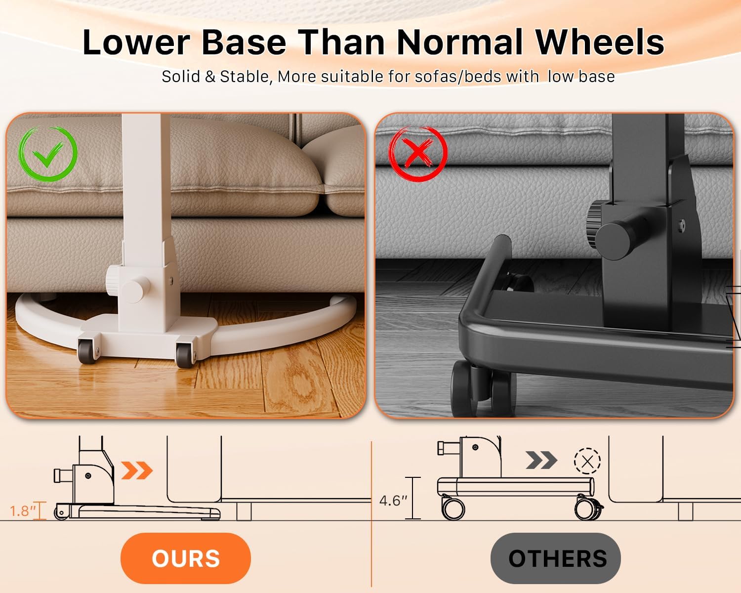 - Recessed Wheels: Designed for lower sofa or bed, the base of the mobile laptop desk can be inserted into a gap as low as 1.9". The solid base adds extra stability to this foldable desk. Round table sides better protect you from bumps