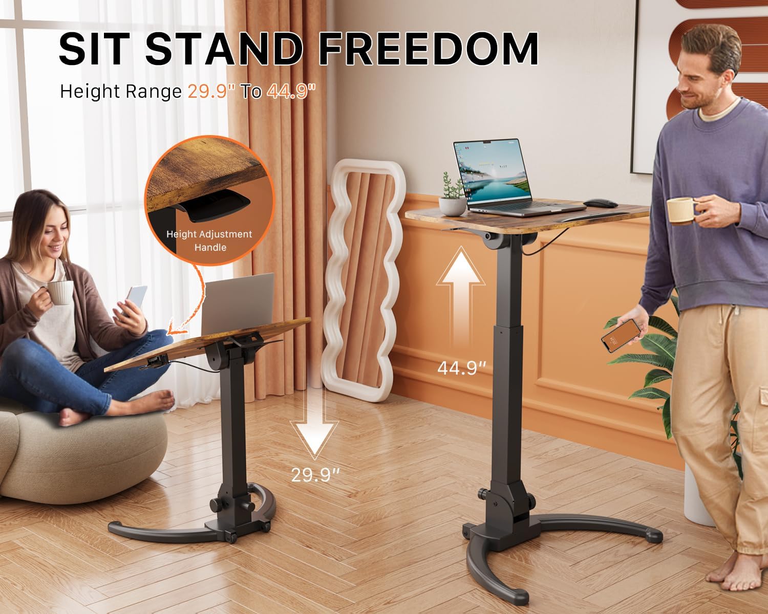 - Gas Spring Height Adjsutable: The height of the rolling computer desk can be adjusted from 29.9" to 44.9" with one-button lifting. Using pneumatic technology, the lifting process is smooth and fast, and easy to switch between sitting and standing positions