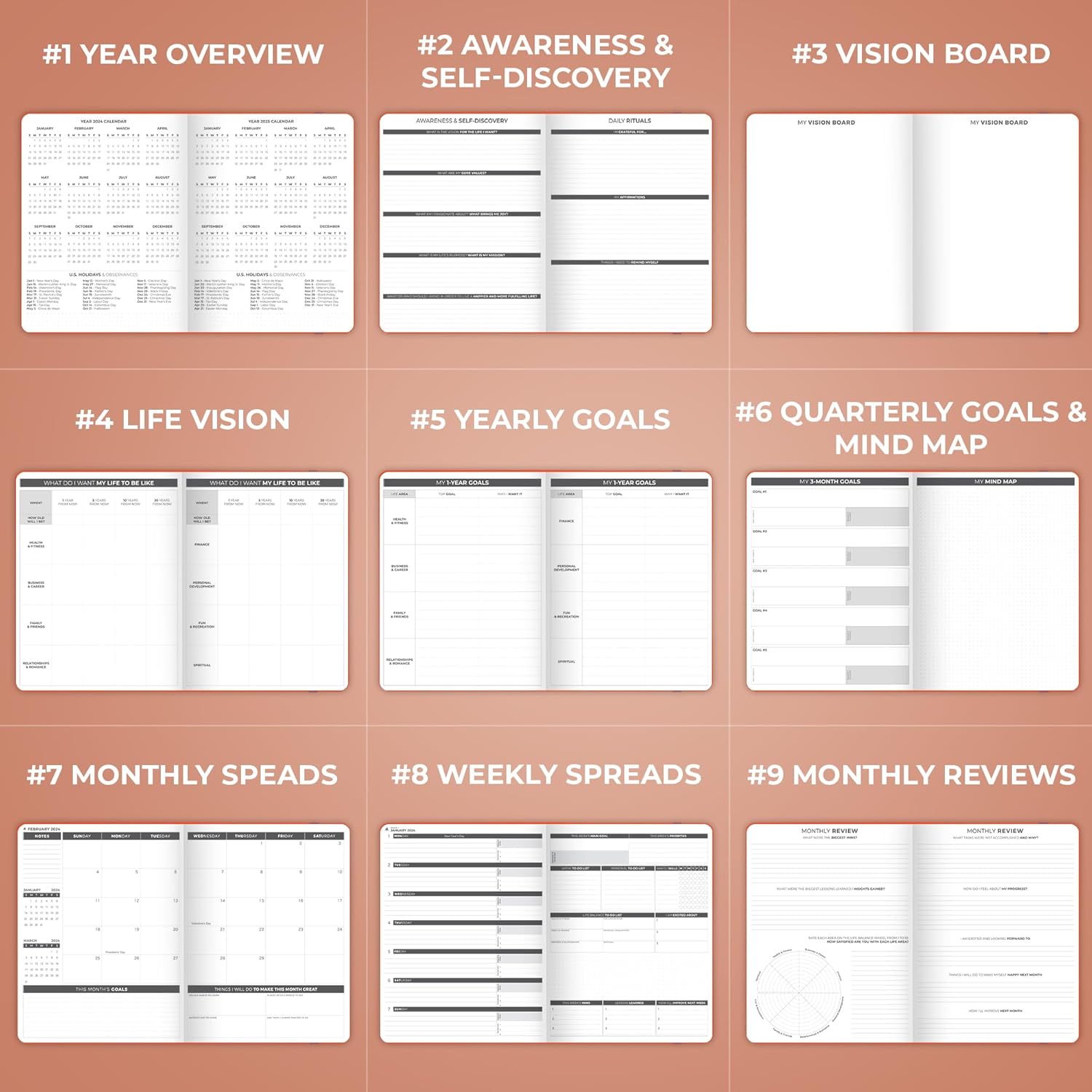 • CREATE A VISION FOR YOUR FUTURE, SET GOALS & START PLANNING – This goal-setting planner 2025 will help you create a vision for your life, define your global goals, and incorporate them into your agenda.