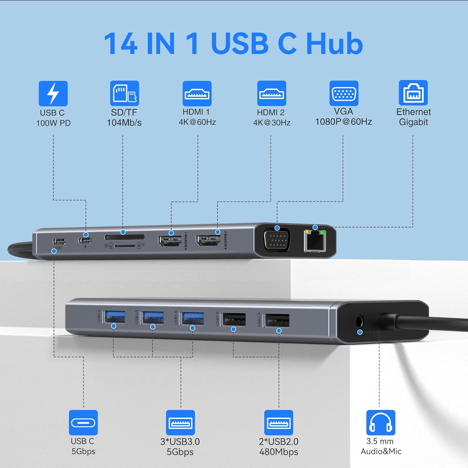 - USB C Docking Station 14 IN 1: With this USB C hub multiple adapter you can easily extend your laptop from one type c/thunderbolt 3 port into 14 ports, you get 2*4K HDMI, VGA, 3*USB 3.0 ports, USB C Data Transfer port(Speed up to 5Gbps), 2*USB 2.0 ports, USB C Power Delivery Port(Up to 100W), Gigabit Ethernet(1Gbps), SD/Micro SD card readers and 3.5mm Mic/audio. USB C to dual HDMI Adapter widely applicable for Dell XPS13/15, Dell Latitude 13 7000/ E7370, Surface/Lenovo/HP etc. laptops