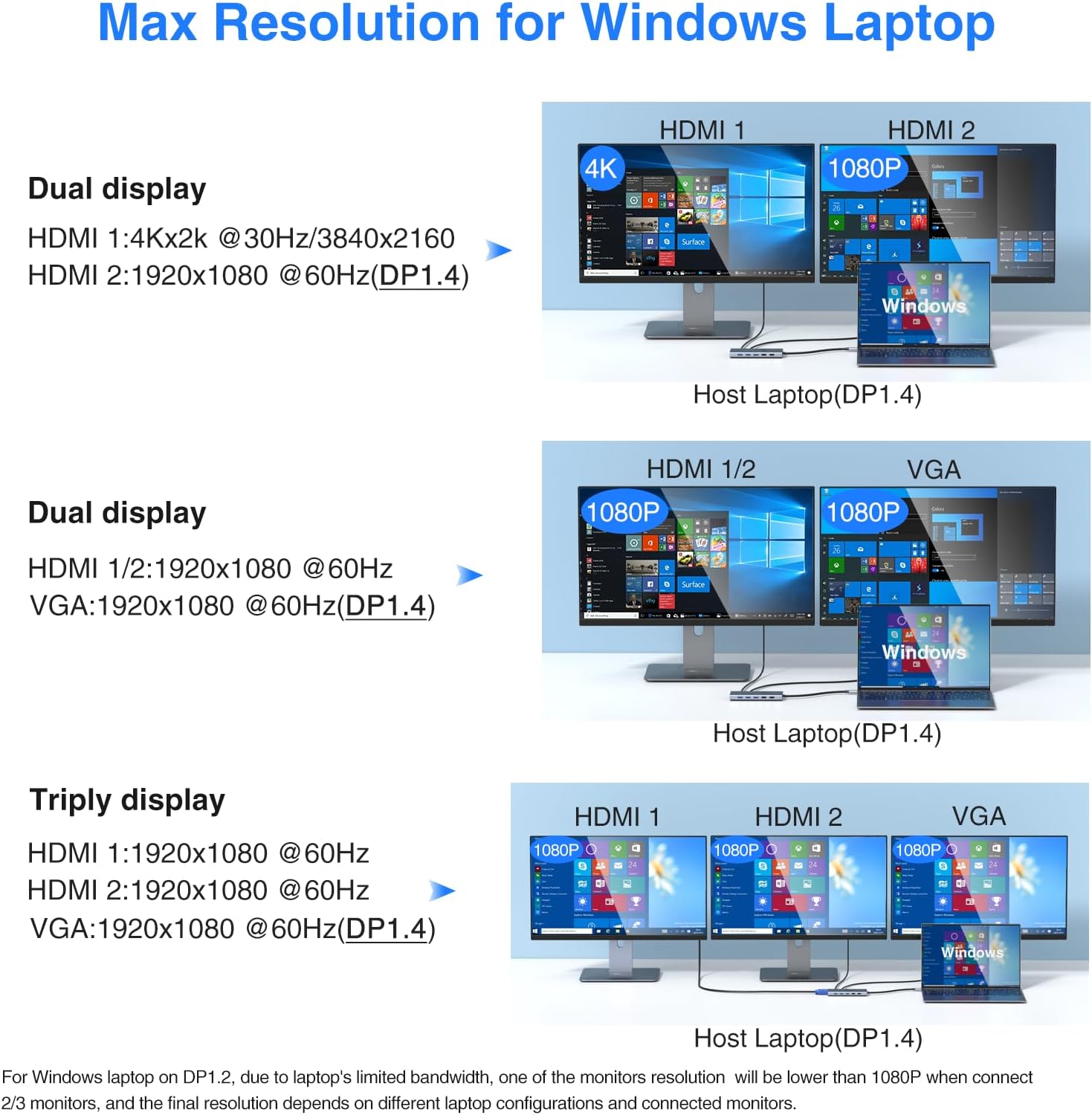 - 4K Dual Monitor&Triple Display: The Docking Station Dual Monitor can easily to achieve dual-monitor and triple-monitor displays for Windows OS, using different monitors to do different projects will make your work/life more efficient. Single use HDMI 1max up to 4K@60Hz, HDMI 2 up to 4K@30Hz(DP1.4 source). When connect 2 displays, 2 HDMI resolution will be 4K@30Hz and 1080P@60Hz(DP1.4). Display output will be 1080P when dual or triple display with VGA. Please Note: Mac OS ONLY support mirror mode