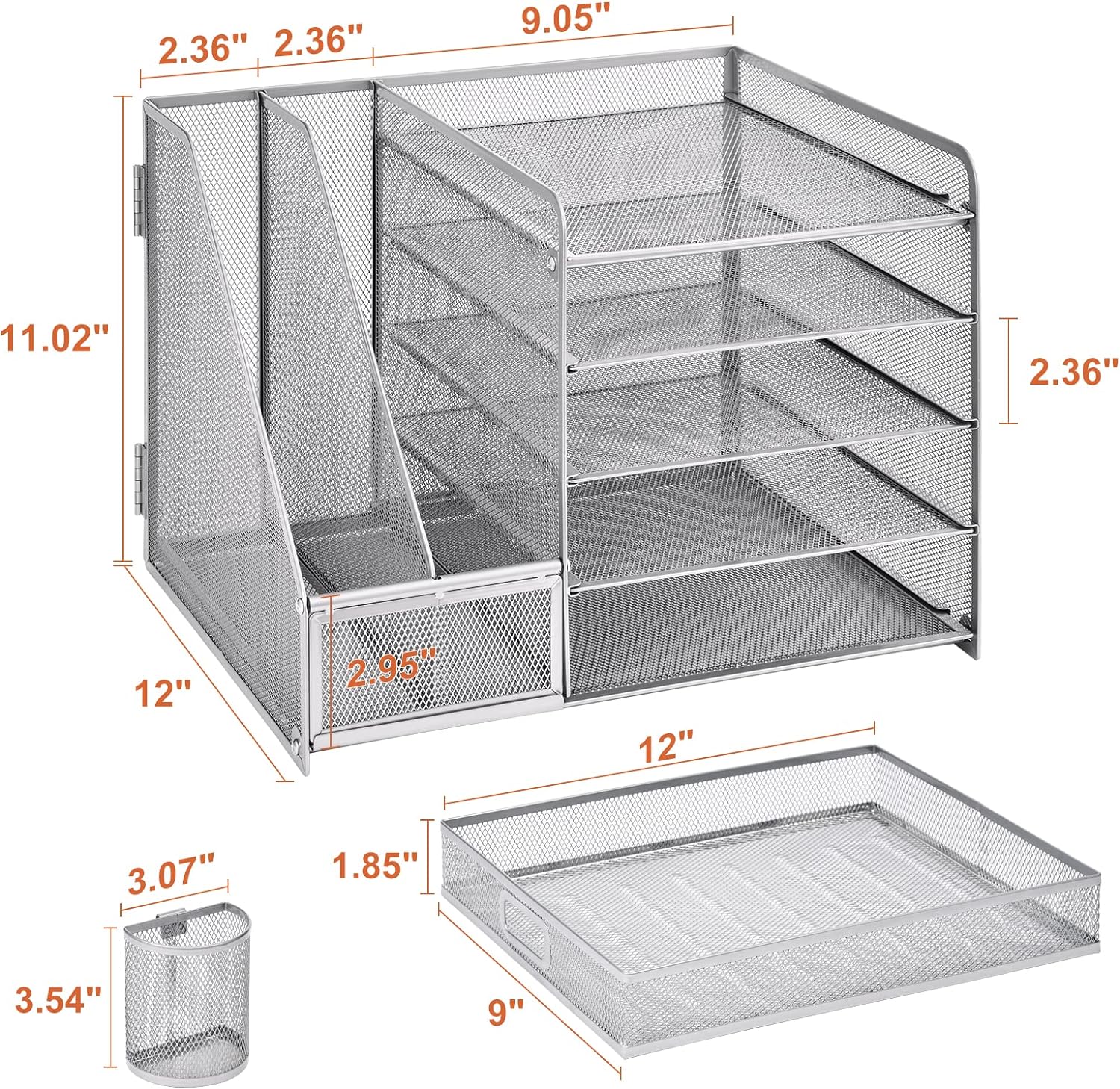 Marbrasse Desk Organizer with File Holder, 5-Tier Paper Letter Tray Organizer with Drawer and 2 Pen Holder, Mesh Desktop Organizer and Storage with Magazine Holder for Office Supplies (Silver)