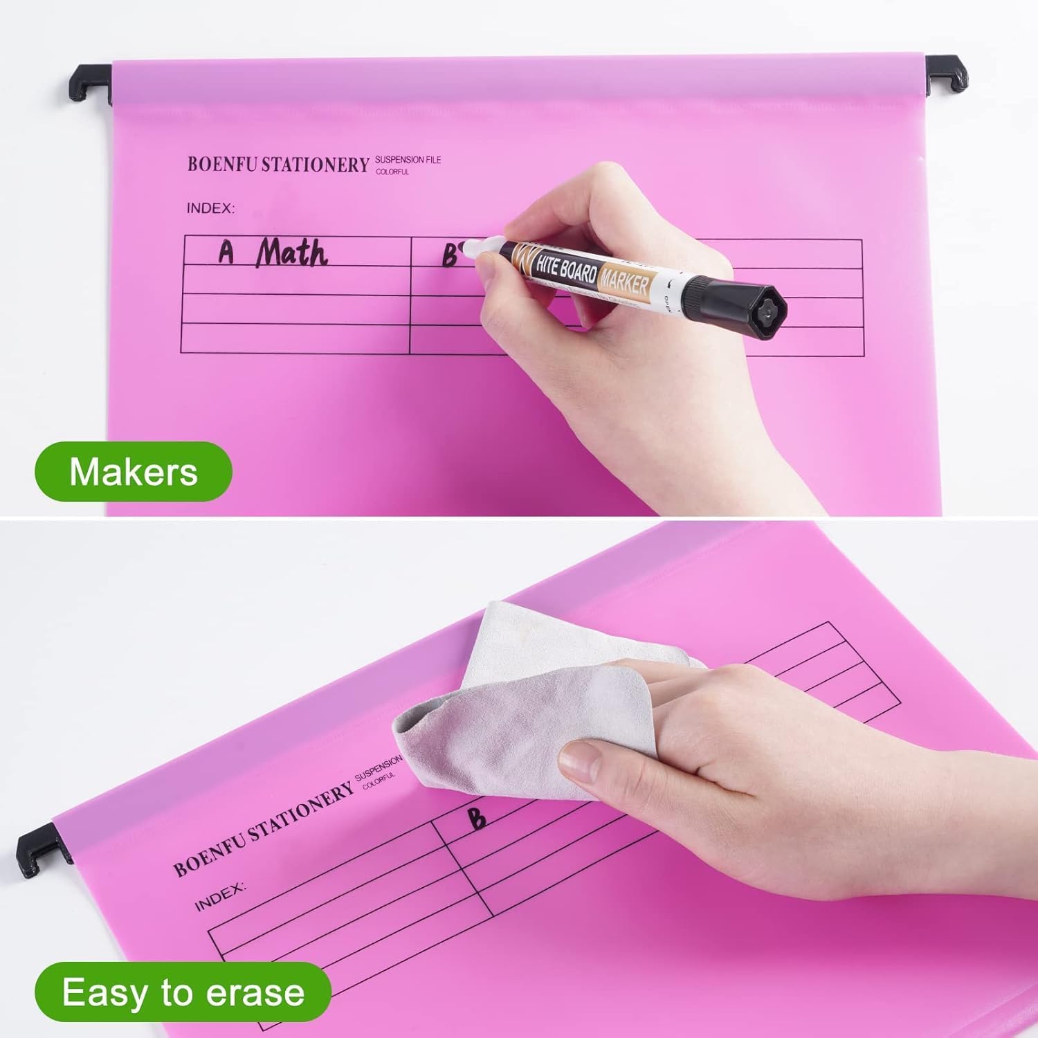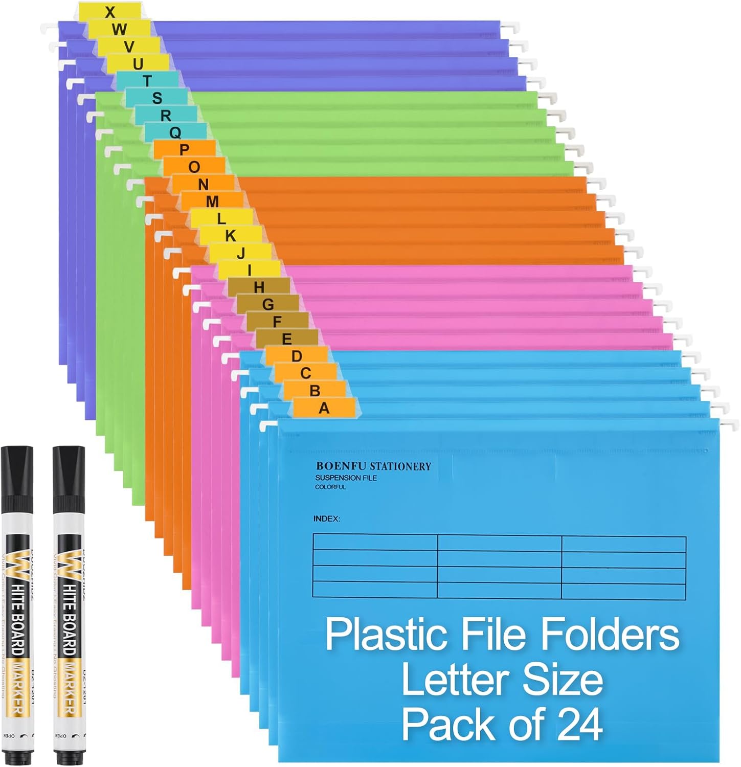 BOENFU 24 Pack Colored Hanging File Folders Letter Size Plastic File Folders with Adjustable Tabs, 2 Markers, Hanging Organizer File Folders for Efficient Filing