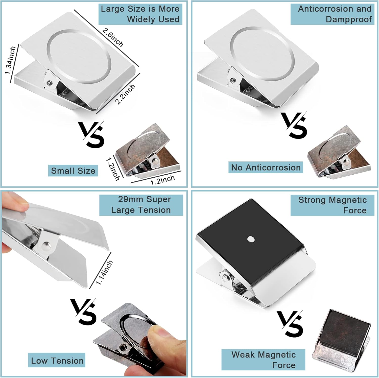 - ✅【Strong Magnet Clips】: Magnet clip width: 2.2 inch ( 56 mm), length 2.6 inch ( 66 mm), magnet clips weight: 3.68oz per clips. The magnetic force of this heavy-duty magnetic clip is much stronger than the ordinary magnetic clip on the market. The square shape conforms to ergonomics. It is very easy to press and has extremely strong grip. It can not only be used to clamp paper items, but also large packaging bags!