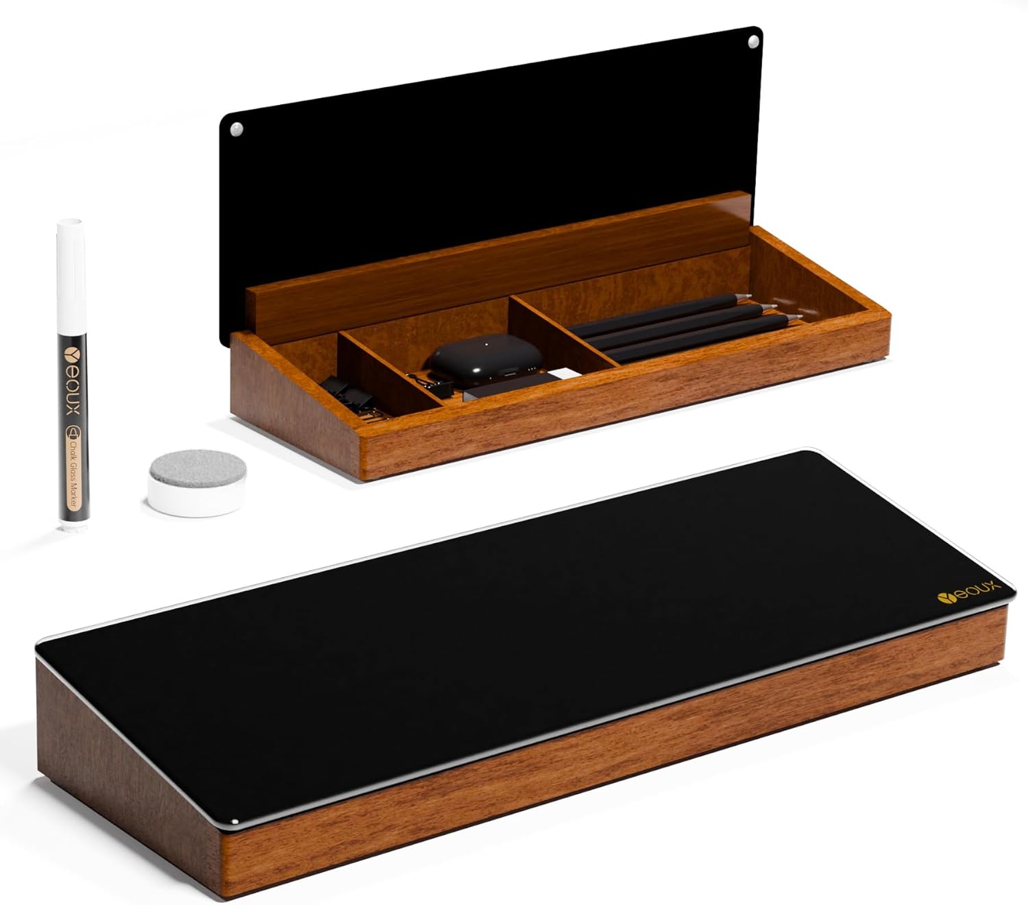 - SLEEK SMART DESIGN | The Ergonomic Angled Glass Surface for Best Experience of Writing & Viewing. 3 Divided Wood Storage Compartments Gives Ample Space for Organizing Office Supplies & Desk Accessories. Our Desk Whiteboard Organzer with Sleek Elegent Design Provide Upscale Presents of Any Office, Home or Workspace Environment.