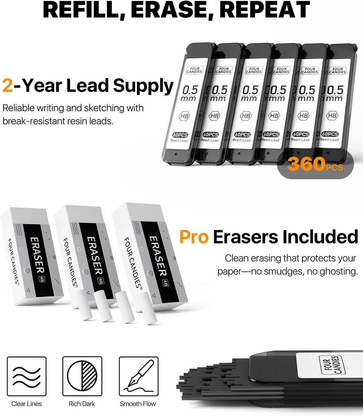 - Super Value Set: This set contains 6pcs 0.5mm drafting pencils and 360pcs HB Lead Refills, 3pcs 4B erasers, 9pcs eraser refills and a plastic storage case; This mechanical pencil set is great for writing, drawing, and sketching