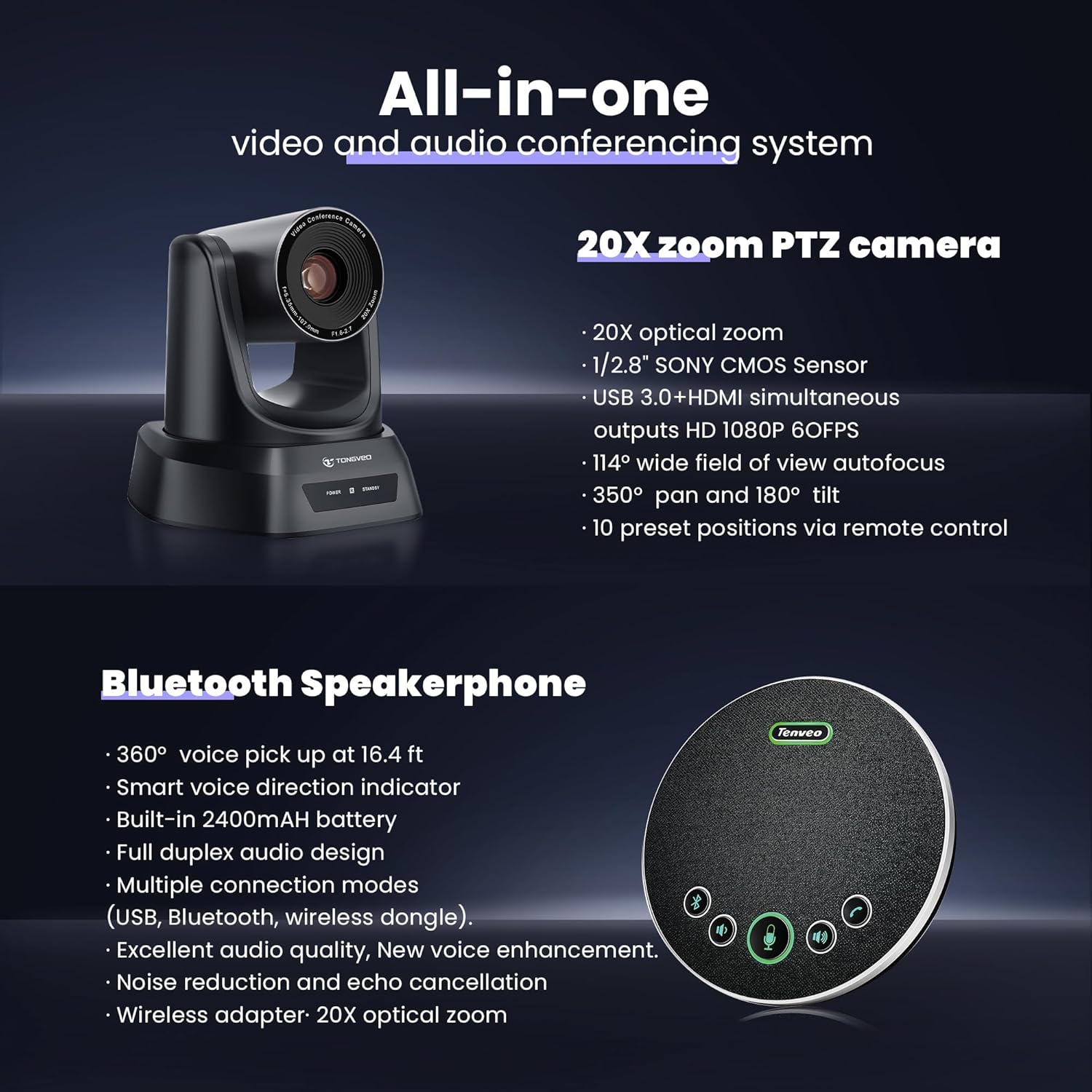 - 20X 1080P 60FPS USB3.0 HDMI PTZ CAMERA BUNDLE WITH SPEAKERPHONE OFFERS COMPLETE VIDEO AND AUDIO SOLUTIONS.TONGVEO's Conference Room Camera System integrates an HD 1080p HDMI PTZ camera and Bluetooth conference speaker into one sleek design. Perfect for professional video conferencing in any meeting space, the Bluetooth speakerphone and HD camera work seamlessly together, ensuring clear video and audio communication simultaneously. Crystal-clear, professional presentations are guaranteed for medium business conference rooms.