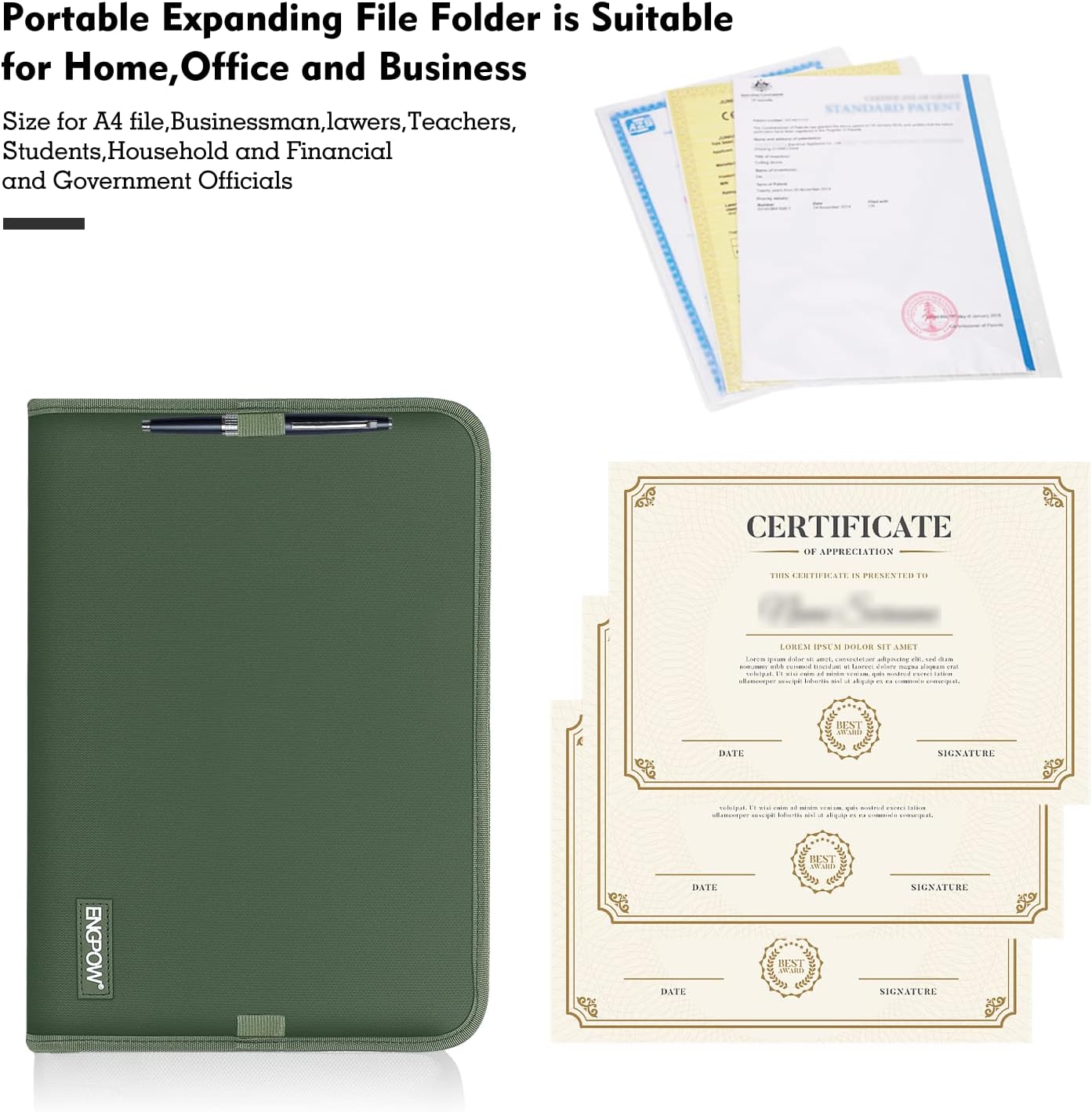 ENGPOW 13 Pocket Expanding File Folder,Fireproof Accordion File Folder Document Organizer with Zipper Closure,Document Folder Safe with Colorful Tabs,A4 Letter Size for Travel,Home,Office,Green