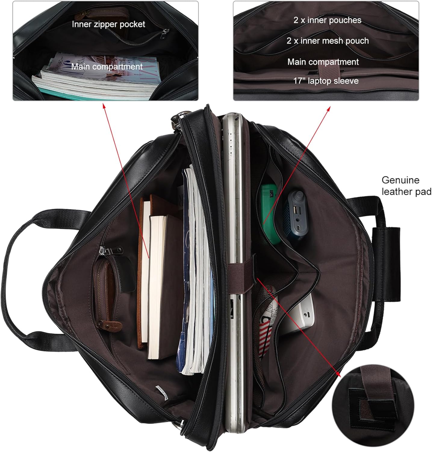 - 【Convertable Luggage Strap】 During long business travel, you can open the zippers of back zipper pocket to let it be luggage strap to hang the brief case on rolling suitcase to release carry fatigue and make travel easier. On daily time, close the zippers to use it as a pocket. The leather bag can be carried as top handle handbag, 17" laptop briefcase, business work office bag, travel crossbody messenger bag, daily shoulder bag, teacher or lawyer attache case