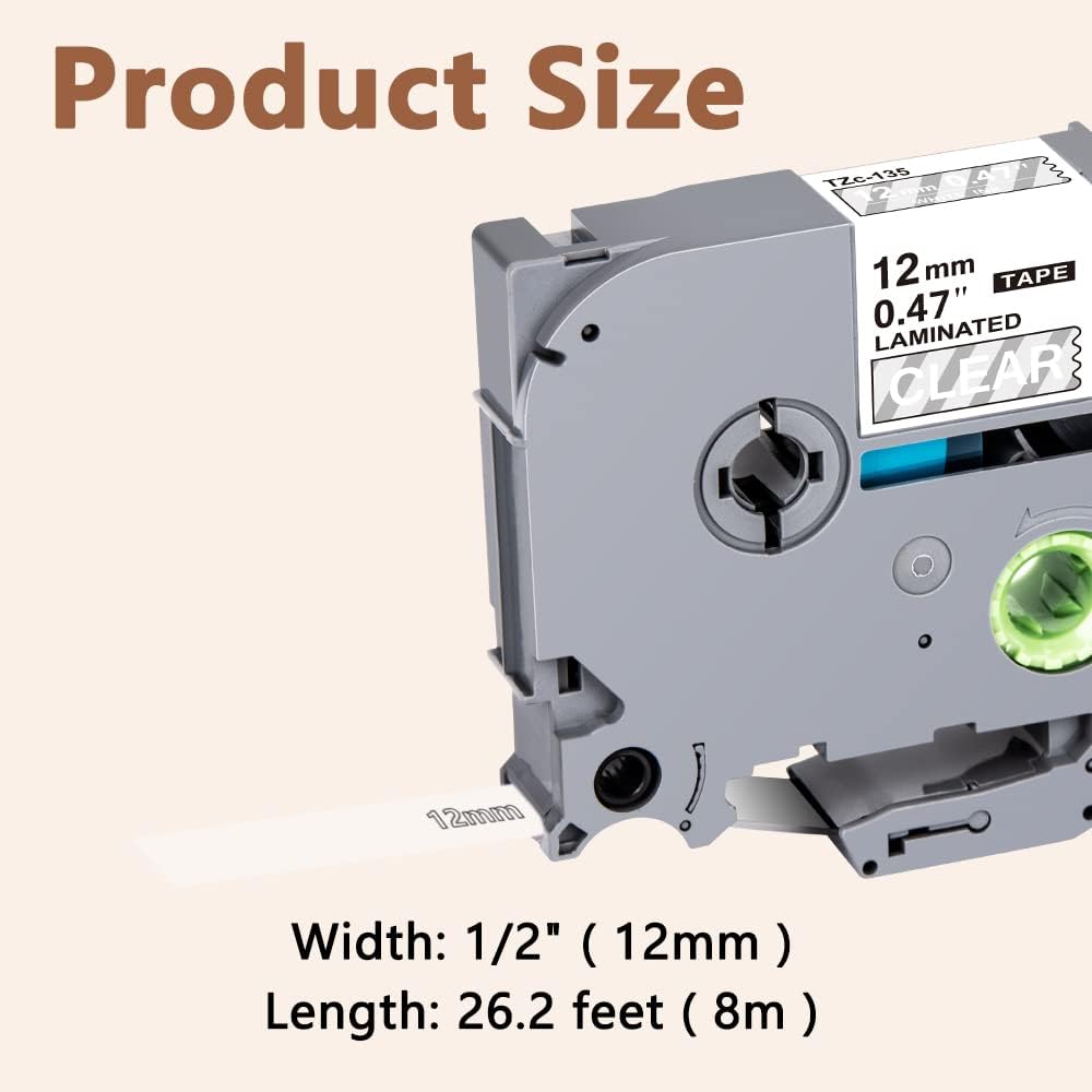 - Size - 1/2" ( 12mm ) x 26.2' ( 8m ) each 12mm label tape. Color - White ink on clear tape