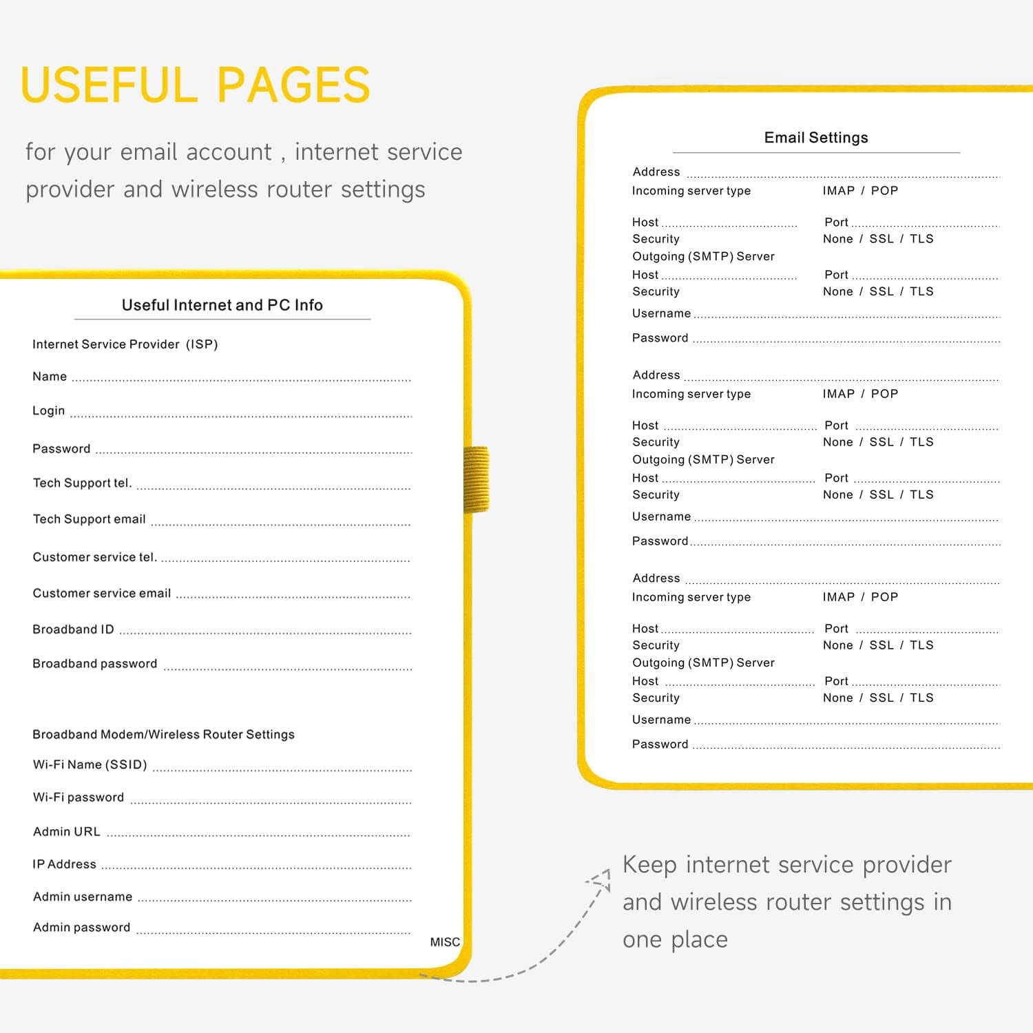 • All-In-One Password Book & More - This password organizer has space to store all the information you may need when you surf the web, including software license information, email settings, wireless router settings, and notes section.