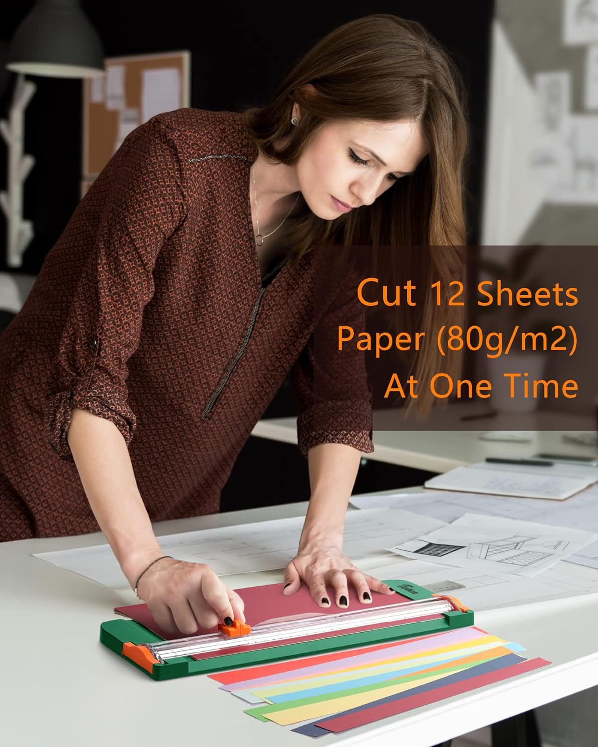 • Efficient to Cut: Dark green paper trimmer is designed to cut A3, A4, A5 Paper, Photos, Cards, Laminated Stuff (within 1.5 mm), and more. Max cut 12 sheets of paper (80 g/m2) each time. Cut a little less prolongs blades' service life