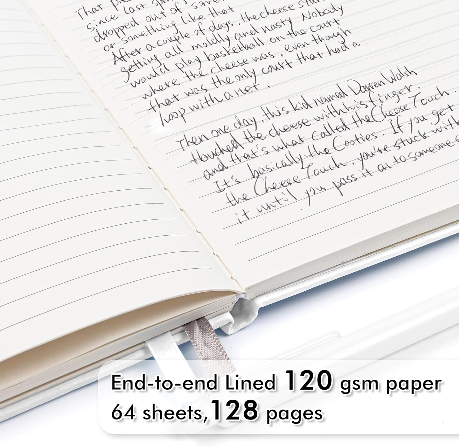 - These classic ruled notebooks are all blank inside with 128 lined pages (64 sheets), which would be convenient for daily usage. The hard cover journal has a water-resistant faux leather cover, round corners and bookmarks, which is designed to lay and open flat. There’s a “date/page” column on the top of every page. You can use it as a reminder to let you remember those important dates and find the page you want in a very short time.